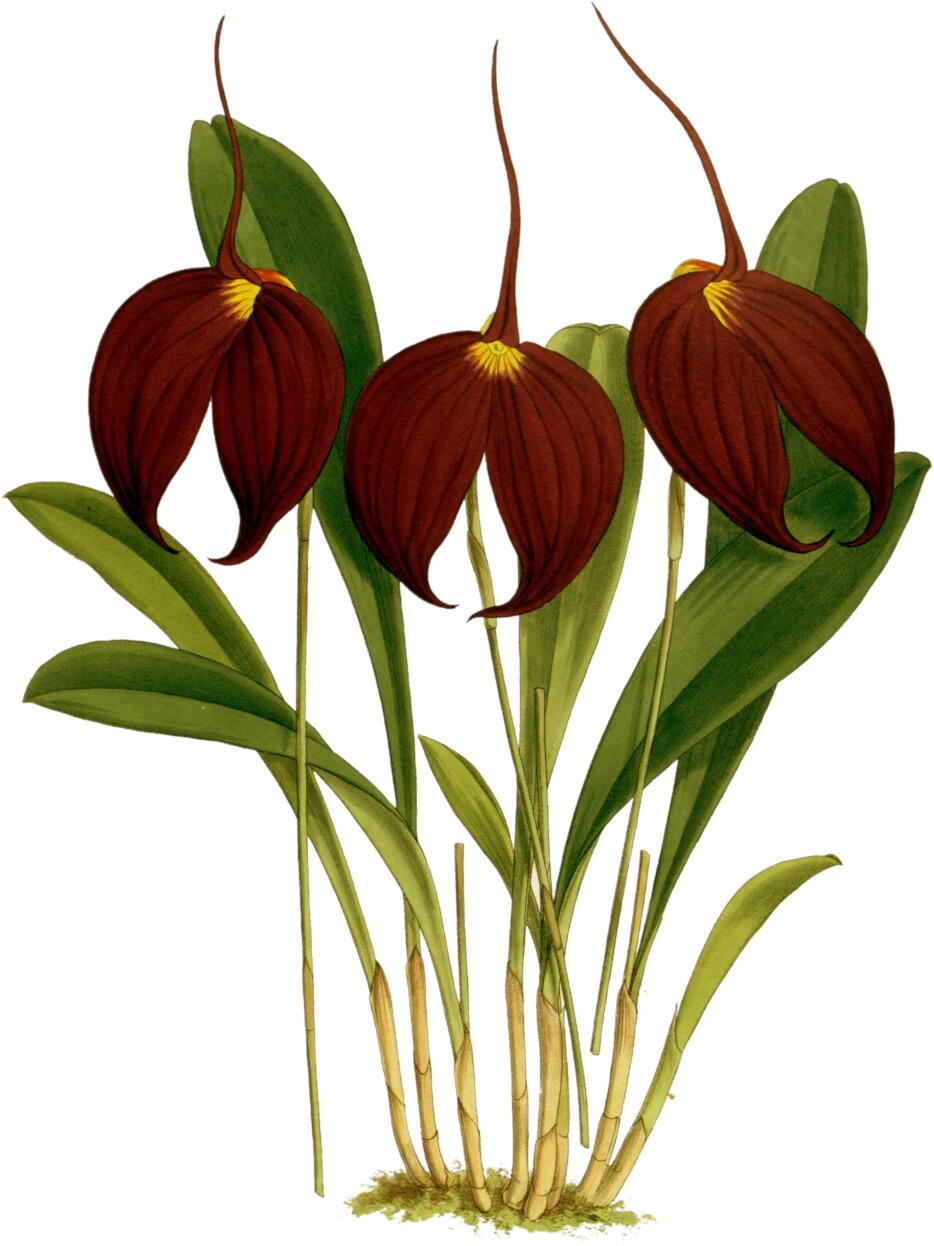 Epiphytal. Pseudobulbs ovate or sometimes narrowed and elongate, furrowed, two to three inches long, tapering upwards, clustered. Leaves two, from the apex of each pseudobulb, broadly lanceolate, plicate, submembranaceous, light green, about a foot long. Scape radical, pendent, one and a half foot long, brownish purple, bearing a raceme of several flowers. Bracts large, membranaceous, ovate-lanceolate, two or three sheathing ones on the scape, and one at the base of each pedicel. Flowers large, very peculiar in form, ochraceous yellow, curiously spotted and blotched with deep wine-purple; sepals conduplicate flexuose, membranaceous, the dorsal one small, oblong, the lateral ones broad, at first spreading, but at length becoming reflexed and resembling bats’ wings, pale ochraceous yellow, the surface thickly spotted with small dots of deep wine-purple; petals oblong, erect, twisted, much smaller than the sepals, of the same colour, but having the spots larger; lip stipitate, continuous with the base of the column, cup-shaped, having a large helmet-shaped pedunculate appendage, the cup yellowish, the appendage creamy white, spotted and blotched on both surfaces with deep wine-purple, the purple colour almost covering the anterior side. Column terete, recurved, two horned at the base, two winged.