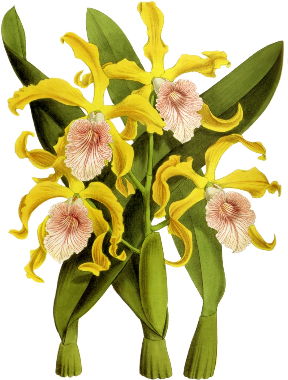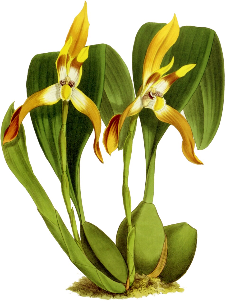 Epiphytal. Stems short, clavate, with a thickened bulbiform base, jointed, deeply furrowed, the internodes almost wholly covered by membranaceous sheaths, bearing leaves at the apex. Leaves two or four, lanceolate, ovate, coriaceous, dark shining green. Racemes many-flowered, drooping, lateral, proceeding from near the top of the stem, just beneath the leaves, the pale green pedicels with a small concave ovate bract at their base. Flowers bright golden yellow, showy; sepals oblong-ovate, bluntish, spreading, of a clear bright golden yellow; petals of the some colour, much broader, roundish-ovate, almost meeting at the edges; lip concave, roundish, subunguiculate, with a small blunt spur behind, pubescent on the upper surface, and denticulate at the edge, of a deep rich orange-yellow, which contrasts agreeably with the lighter and brighter yellow of the outer perianth segments. Column small, pale yellow.
