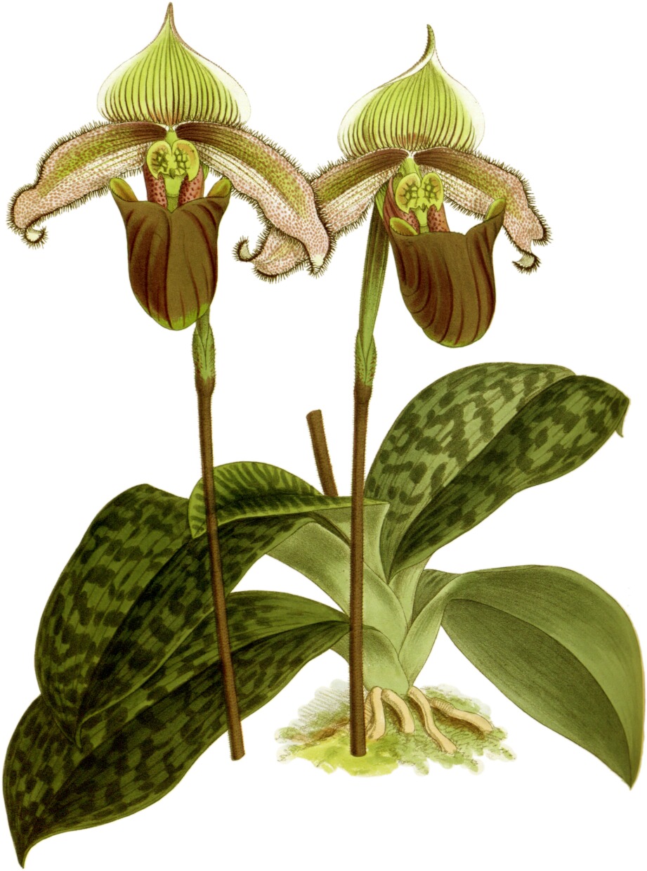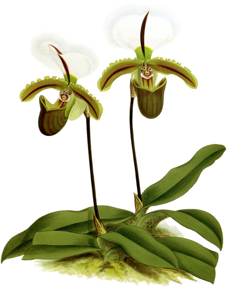Epiphytal. Acaulescent. Leaves spreading, tufted, ensiform, channelled especially towards the base, tapered to the apex, one and a quarter inch wide, green. Scape of a brownish-red colour, tall, branched, bearing several flowers, with longish ovate-lanceolate boat-shaped bracts at the ramifications. Flowers large and handsome, five inches in lateral, three and a half inches in vertical expansion; dorsal sepal oblong ovate bluntish, pale watery green with several longitudinal purplish and darker green intermediate ribs, slightly flushed with red, the purple tint stronger on the glossy exterior, which is olive green, the extreme edge white; lower sepal broad ovate, half as long as the lip; petals two and a half inches long, over half an inch broad at the base, narrowing to the apex, pale greenish white in the centre with an edge of wine-red one-eighth of an inch wide which meets towards the end so that the apex is wholly wine-red, the colour deeper and glossy outside with the central parts olive, the inside covered over with pellucid hairs, those on the lower half near the base longer and purplish; lip bold, oblong obtuse, nearly two inches long, the pouch deep wine-purple in front, paler behind, the sides deeply inflexed and with a roundish projecting lobe at the front angle of the aperture, greenish or creamy white with a few irregular purple spots, the inside of the pouch more distinctly spotted. Staminode greenish white clothed with short stiff hairs, transversely oblong or reniform with an apiculus and having a fringe of short dark purple hairs on the front margin, the sterile lobe roundish, fleshy, greenish white, hairy.