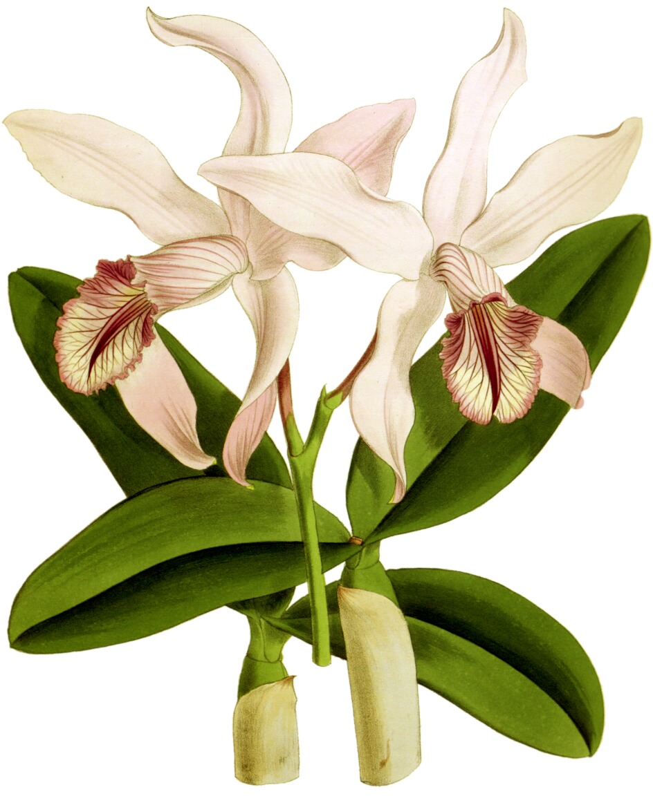 Epiphytal. Stems thin, fusiform, a foot to a foot and a half in height, diphyllous, invested by a sheathing mucronulate scale. Leaves cuneate ligulate, bluntly acute, six to nine inches long, coriaceous, of a light green. Peduncles two flowered issuing from a small narrow spathe. Flowers five to six inches across, delicately coloured; sepals ligulate-oblong acute, entire, of a flesh-colour or pinkish blush with purple veins, the dorsal one three inches long and three-fourths of an inch wide, the lateral ones somewhat longer and broader, slightly falcate-deflexed; petals linear-oblong blunt, three inches long, and an inch broad, of the same pinkish-blush or pale rosy-lilac as the sepals, but more distinctly veined; lip three inches long, rosy lilac, marked by longitudinal veins, with a cordiform base, three-lobed, the lateral lobes folded over the column and about twice its length, the front edge rounded and slightly wavy the middle lobe projecting an inch and a half, roundish-oblong, obtuse, apiculate, prettily veined with magenta, the few strongish central veins parallel, the rest divergent and variously netted, the tip paler, the veins continued through to the margin which is crispulate. Column decurved, semiterete, winged, magenta except about the stigmatic hollow which is white, the apex toothed.