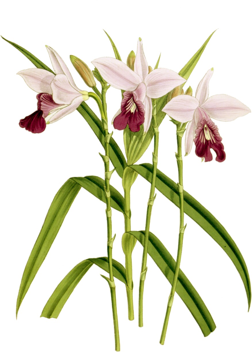 Terrestrial. Stems erect, terete, striate, with the habit of a small bamboo, three to five feet high, as thick as a stout quill or one’s little finger, polyphyllous. Leaves a span to a foot in length, distant, distichous, ensiform, with the base sheathing the stem, and the apex attenuated, erect and spreading, the upper ones on the flowering stems reduced to sheathing bracts, which are numerous, short, ovate acute, spreading at the tips, so that the peduncles are ochreate, of a whitish green, and terminate in a spike, sometimes branched, of several showy blossoms. Flowers large and effective, measuring about two and a half inches across; sepals narrow lanceolate, entire, the dorsal one erect, the two lateral ones sub-parallel, directed downwards, of a pale pink colour; petals ovate, plane, spreading laterally, of a deeper pink than the sepals, with a rose-pink stripe down the centre; lip three-lobed, the lateral segments rolled over the column, pink, abruptly abbreviated in front, where they are recurved and deeper in colour; middle segment larger, bipartite, the divisions bluntly obovate-oblong, divaricate and crisped, of a magenta-rose, the throat white in the lower part, marked with white lines on each side, the disk bearing two fleshy undulated lamellæ or crests, and a third shorter straight one between them. Column clavate, semi-terete, lying parallel with the lip.