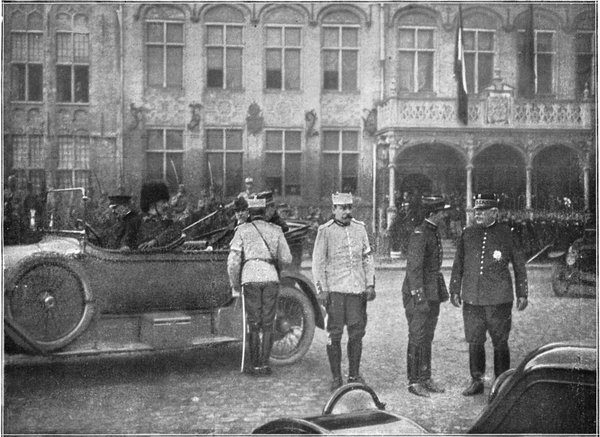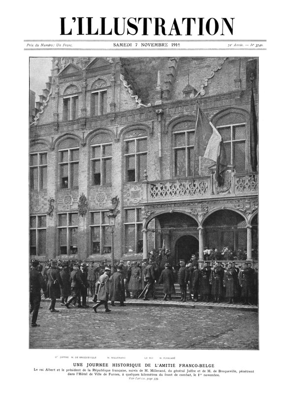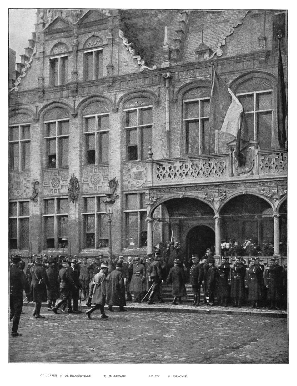Le roi Albert et le président de la République française, suivis de M. Millerand, du général Joffre et de M. de Broqueville, pénètrent dans l’Hôtel de Ville de Furnes, à quelques kilomètres du front de combat, le 1er novembre.