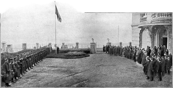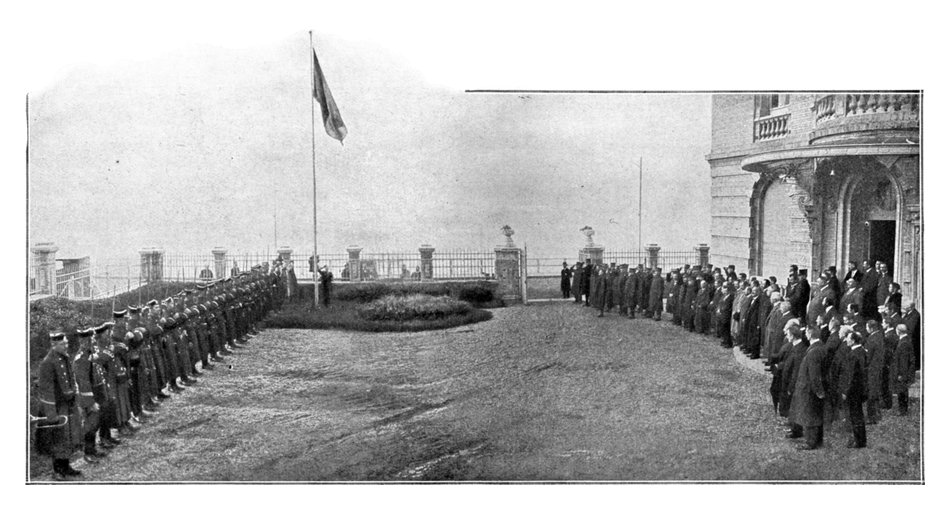 LE GOUVERNEMENT BELGE AU HAVRE.—Une cérémonie quotidienne: chaque matin, devant l’hôtel affecté au ministère de la Guerre de Belgique,