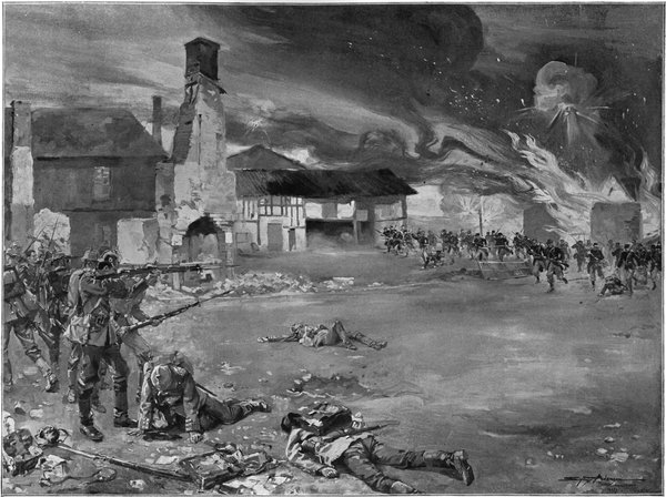 Dessin exécuté par M. Sydney Adamson, à Sommesous (village de la Marne, non loin de Vitry-le-François), d’après les indications précises d’officiers ayant participé aux combats de septembre sur ce point et qui ont certifié exacte la composition de l’artiste anglais.