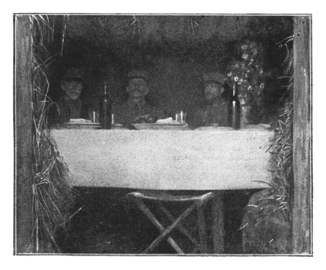 Ensuite, le colonel, qui nous avait priés à déjeuner, nous introduisit dans la salle à manger qui est de construction et de style 1914: trois marches pour y pénétrer, des murs uniformément bruns—terre de Sienne, si vous voulez—un plafond aux poutres apparentes sur fond de gerbes de blé, assez haut pour permettre au plus bel homme du régiment de se tenir debout sans courber la taille... Coquetterie: la table, à la nappe blanche immaculée, était parée de fleurs.