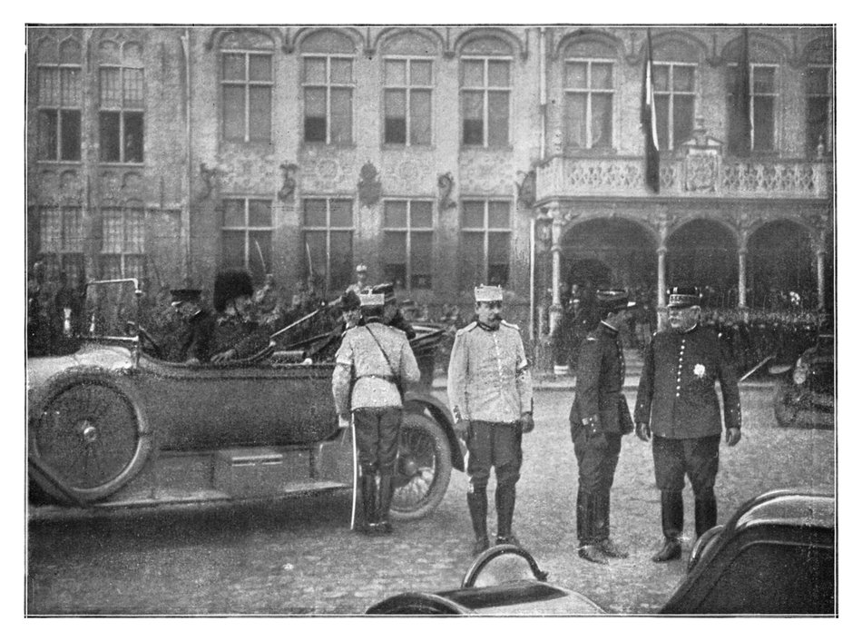 De là, les deux chefs d’Etat, avec les deux ministres de la Guerre et le général Joffre, gagnaient Furnes, que nos avions protégeaient contre les taubes. Des troupes, belges et françaises, étaient massées sur la place de l’Hôtel-de-Ville. Le roi et le président, aux accents de la Marseillaise et de la Brabançonne, les passèrent en revue. Une longue et affectueuse entrevue suivit, dans l’un des salons de l’Hôtel de Ville, à la suite de laquelle le roi tint encore à reconduire M. Raymond Poincaré aussi loin que possible, dans la direction d’Ypres, où opèrent avec une endurance, une ardeur admirables, des troupes françaises au milieu desquelles le président, le ministre de la Guerre et le généralissime allaient terminer leur journée.
