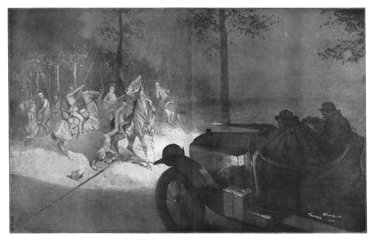 Il y aura, en des temps plus calmes, tout un véritable «romancero» à écrire sur le rôle de l’automobile et la vie des chauffeurs en campagne. Il sera fertile en péripéties émouvantes, et neuves, surtout, et pleines d’imprévu. Que de rencontres étranges ainsi, au coin d’un bois, au détour d’une route, où l’homme du volant dut rivaliser de sang-froid avec son compagnon, son garde du corps! Que de traits élégants où l’esprit français, fertile en ressources, triompha de la lourdeur ennemie et où, grâce à un coup de volant décisif, à l’allumage brusque des phares électriques qui effraie les chevaux, ou enfin à quelques adroits coups de fusil, furent sauvés la voiture et ceux qui la montaient!