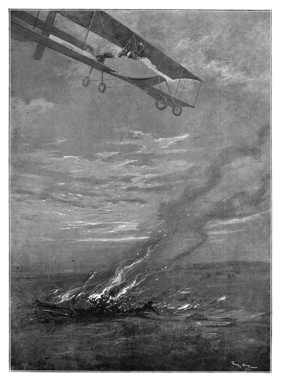 Si les aviateurs des diverses armées alliées accomplissent chaque jour des prouesses, ces exploits n’ont en général pour témoins que les bataillons ennemis; les nôtres les connaissent seulement par le rapport ou... par les journaux. Pourtant, il n’est pas un soldat du front qui ne rêve d’assister à un combat aérien, prêt à applaudir aux derniers tournoiements de l’avion allemand blessé à mort. De ces rencontres il n’a encore été pris, il ne sera peut-être pris aucun cliché. Des indications et un croquis fournis par un spectateur du combat que nous avons déjà mentionné (numéro du 24 octobre) ont du moins permis d’en représenter très exactement la phase finale. C’était à Jonchery, près de Reims. Un avion allemand, du type «Aviatik», après avoir survolé nos troupes, se préparait à regagner son camp. Aussitôt, le sergent Frantz et le soldat Quenault s’envolent sur un biplan armé d’une mitrailleuse. Arrivé à une grande hauteur, l’appareil français attaque son adversaire de flanc: bientôt le moteur de celui-ci explose, déterminant l’incendie de l’appareil qui s’abat lourdement dans les lignes françaises. Des deux côtés les soldats étaient sortis de leurs tranchées pour mieux suivre les péripéties du drame. Tandis que les débris de l’ «Aviatik» achevaient de flamber près de deux corps carbonisés, ils virent le biplan français descendre majestueusement, en décrivant de grands orbes autour du brasier.