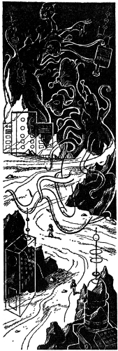 Now, just as the beasts reached Helen Gorman, one of Gop's tentacles came through the doorway, followed by one of his smaller heads. The Junior Scientist picked up Helen, and hastily extruded another tentacle from the first to bat aside one of the beasts that leaped after her.