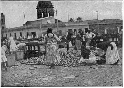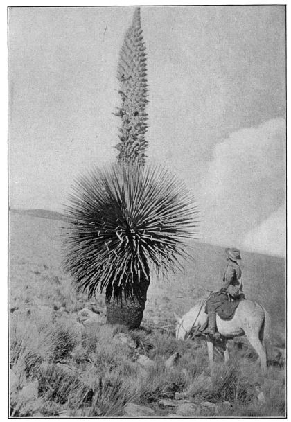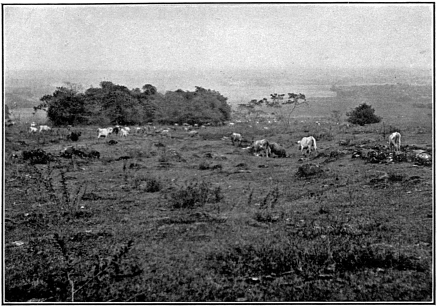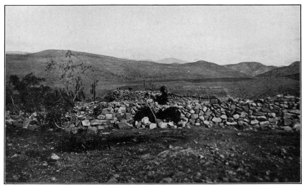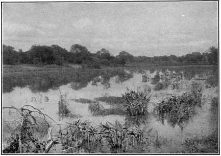Investigation showed that the country was not quite so barren as it had at first appeared. A short walk took us into a region where there was a dense growth of cacti and thorny shrubbery—so thick in fact that it was almost impossible to get through; many of the former plants were in bloom, the spiny columns being covered with large white, waxy flowers. Here and there a native hut adorned the top of a small rise in the landscape, and near by we were sure to see the inevitable flock of goats nibbling on the leaves of acacia and mimosa, and guarded by bad-tempered dogs. A little distance away from each hovel was a pond of considerable402 size; these fill up during the short rainy season and their contents are used to water the stock and to irrigate the small patches of corn and potatoes.