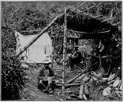 416 Our eight by twelve foot “balloon silk” tent had been put up under a shed adjoining the house; this protected it from the wind on at least one side. To be of any use in the tropics, the tent must of course be provided with a ground-cloth and bobbinet curtains; it should also contain a window, screened with netting, in the roof. We did not need the curtains, so tied them back. A brazier was kindled, and after it was filled with glowing embers, it was taken into the tent; it warmed the tent thoroughly within a few moments and kept a fire all night. The window, which was always kept open, served its mission splendidly as a means of ventilation.