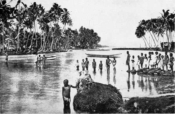 I was entranced as I stood on deck, and with all the fevered imagination of boyhood drank in the natural beauties of that land-locked bay. The inland mountain slopes, that reached their zenith in the peak of Ua Pu, were clad with feathery palms and beautiful pauroas. Peeping beneath the shore palms were the birdcage-shaped bamboo homes of the native village. It was silent and deserted on that “Pious Morn,” but its inhabitants would return. For lo! floundering in the ocean waters around the schooner, and clambering on the deck, were the handsome, mahogany-hued, scantily attired people of that little village. No wonder that I felt that I had, at last, arrived at the wonderful isles of dim Romance.