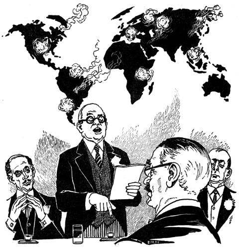 Thompson sat down. The minutes of the last conference were read by a mechanical secretary. A summation of their final agreement on Operation Push Button was briefly reviewed by the automatic translating secretary. No changes were suggested.