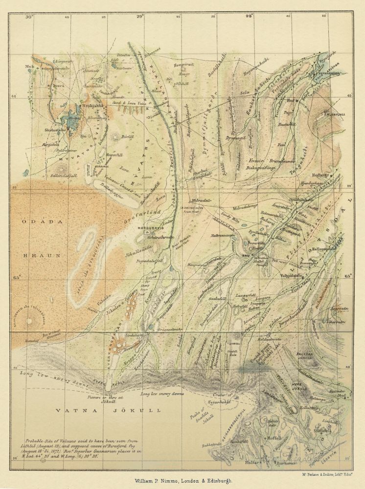 Welcoming us kindly, the Professor sat in his stuffed chair before a little table, and I noticed that he swayed his body to and fro like a Moslem boy reading the Koran. We talked of{12} his past life: he had forgotten the details, but he remembered the main points. After spending his youth in teaching mathematics and natural philosophy at the College, he resolved to map out his native island with theodolite, compass, and reflecting circle, and to this labour of love he conscientiously devoted twenty years, not twelve nor eighteen, as has been generally said. He was not very sure about his proceedings upon the Vatnajökullsvegr, the path north of the great south-eastern glacier, before his time considered utterly impracticable; and my curiosity was chiefly for this point. He mentioned his fellow-traveller, Síra Sigurðr Gunnarson, then a young man, who had just taken his degree. He believed that the march took place in July or August, but not after. Of the eight ponies, two were laden with hay, and they found grass at Tómasarhagi, north-west of the Vatnajökull. During his march, no volcano was observed, either in the glacier or to the north of it; and he seemed to have neglected tracing out the sulphur diggings.