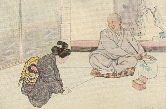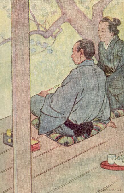 At the call of her mother, Yuki San silently pushed open the screen and made her low and graceful greeting. Custom forbidding her to take part in the conversation, she busied herself with serving the tea, listening while Saito San recounted various incidents of the picturesque court-life, or told of adventures in the recent war.