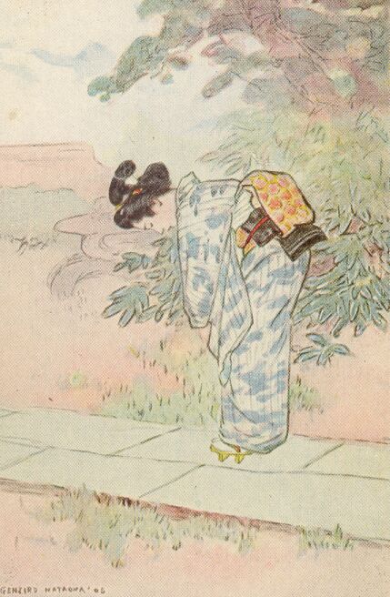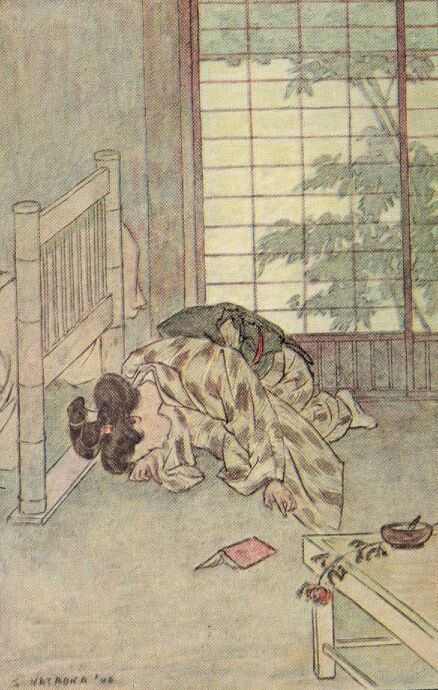 Presently the clatter of the jinrikisha in the courtyard announced the arrival of the guest. Yuki San heard the long ceremonious greeting of her father. She saw her mother hasten away to do her part and, left alone, she sat with troubled eyes and drooping head.