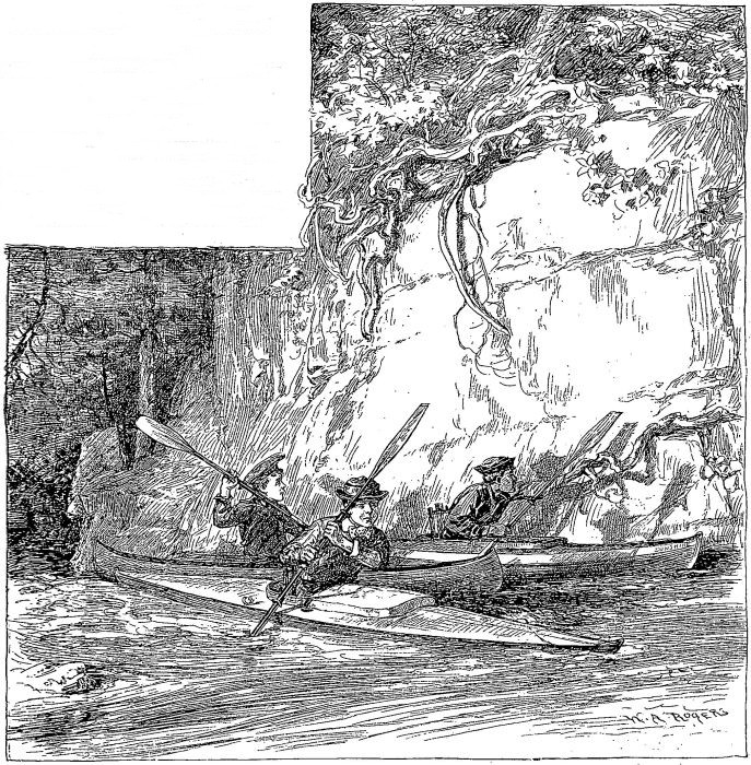 When the boys were compelled to jump overboard, they could see that the water was only about two feet deep, but they did not know whether they could stand[Pg 722] up against the fierce current. They found that they could, although they had to move slowly to avoid being swept off their feet. Harry's canoe was easily pushed off the rock on which it had run, and the moment it was out of the way the other canoes were free. Each canoeist seized the stern of his own canoe, and let it drag him down the rest of the rapid, which fortunately was a short one. While performing this feat the knees of the canoeists were scraped over the rocks, and they received several bruises; but they thought it was impossible to get into their canoes in swift water, and so had no choice except to float down hanging on to the sterns of the canoes.