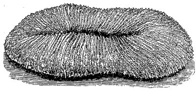 The mushroom coral (Fig. 2) looks indeed like a large mushroom, although you will notice that the leaflets are on the upper surface instead of being underneath, as they are in the vegetable mushroom. This coral is the skeleton of one huge polyp, and we see the depression in the centre corresponding to the little cups on most other corals.