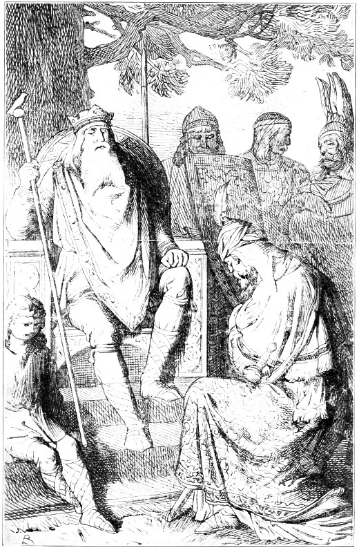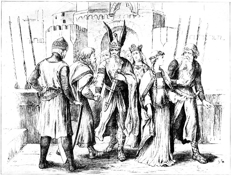 On the twelfth day they were summoned before Hetel who, seated on a shining throne and surrounded by his vassals, received them graciously and asked their errand. One of the knights stepped forward and delivered to him the letter containing King Ludwig’s suit for his son Hartmut; but scarcely had he learned its contents when his brow darkened and he cried angrily: