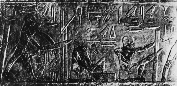 Wie man mit Bronzesägen arbeitete, erkennen wir aus den Reliefs der berühmten Grabkammern eines ägyptischen Totenpriesters, namens Ti, der ums Jahr 2700 v. Chr. bei Sakarah in Ägypten beigesetzt wurde. Es ist eine lange Reihe von Handwerkern bei den verschiedensten Verrichtungen dargestellt, so auch die hier wiedergegebenen Säger (Seite 10).[6]