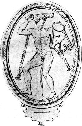 Daedalos wird im Altertum mit einer Säge in der Hand abgebildet (Seite 13). Hier sehen wir ihn mit diesem Werkzeug vor der von ihm angefertigten hölzernen Kuh, die er für die Gattin des Königs Minos lebenswahr gebildet hatte[11].