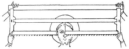 Auffallend ist, daß man auf der Saalburg wohl erhaltene hölzerne Arme zu Rahmensägen fand [19], die eine recht ungünstige Anordnung der Spannung zeigen. Unser Mittelbaum ist hier so beiseite gerückt worden, daß bis zur Spannkordel ¼, bis zu den Nieten des Sägeblattes etwa ¾ Abstand ist. Bedingt wurde diese Anordnung dadurch, daß die Römer, wie wir auch auf Seite 19 sehen, drehbare Hefte zur Verdrehung der Sägeblätter nicht kannten.