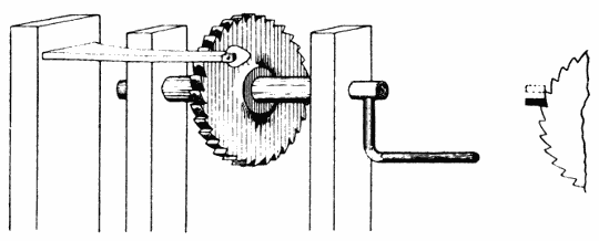 Theophilus sagt[25]:.... ».... Wenn du also das Eisen bearbeitet und daraus Sporen oder andere Gerätschaften .... gemacht hast und sie mit Gold oder Silber schmücken willst, so nimm reinstes Silber und mache[S. 23] es durch Hämmern sehr dünn.« Theophilus spricht also hier von der Verzierung durch Tauschieren. Man muß zur Anbringung der dünnen Silberstreifen Einschnitte in das Eisen machen. Dies soll mittels folgender Maschine geschehen: »Dann habe eine Maschine aus Eichenholz, einen Fuß im Durchmesser und gedrechselt. Sie sei am Umfang dünn und in der Mitte auf jeder Seite dicker, hier sei ihr ein anderes gekrümmtes Holz, daran sie sich drehen läßt, durchgesteckt. Diesem sei an einem Ende ein anderes gebogenes Stück Holz angefügt, mit welchem (das Ganze) herum bewegt wird. Hast du dieses Rad nun zwischen zwei Säulen gestellt, so mache an dem Umfang desselben Einschnitte gleich Stufen, die nach rückwärts gekehrt sind. Die Säulen, zwischen denen das Rad liegt, seien fest und der Breite nach am Gestell befestigt, so daß das gekrümmte Holz zur Rechten stehe. Noch befinde sich zur Linken vorn neben dem Rad eine Säule, an der ein dünnes Holz angebracht sei, und zwar so, daß es auf das Rad zu liegen komme, und es habe an der Spitze ein dünnes Stück Stahl, so lang und breit, wie der Nagel eines Daumens. Dies (Stück Stahl sei) in einem Loch fest eingefügt und sehr scharf, sodaß bei der Umdrehung des Rades, während das Holz immer von Stufe zu Stufe fällt, der so in zuckende Bewegung gebrachte Stahl, was in seine Nähe gebracht wird, schneidet (incidat). Wenn du nun einen Sporn.... hast, so stelle ihn auf brennende Kohlen, bis er schwarz wird, wenn er kalt wurde, halte ihn in der Linken und drehe das Rad mit der Rechten, nähere ihn dem Stahl, schneide mit Sorgfalt überall....« Unklar ist die Textstelle von Theophilus nur dort, wo er zum zweiten Mal von einem gekrümmten Holz spricht. Mindestens ist die zweite Krümmung nicht notwendig, und ich habe sie deshalb in der Rekonstruktion durch einen geraden Kurbelgriff ersetzt.
