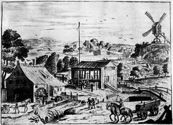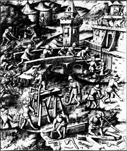 Am Ufer sehen wir werktätiges Leben: es wird alles hergerichtet, was zum Bau notwendig ist. Im Hintergrund, am Wald, werden die gefällten[S. 31] Bäume von Zimmerleuten zugerichtet und im Vordergrund zu Konstruktionen zusammengesetzt.