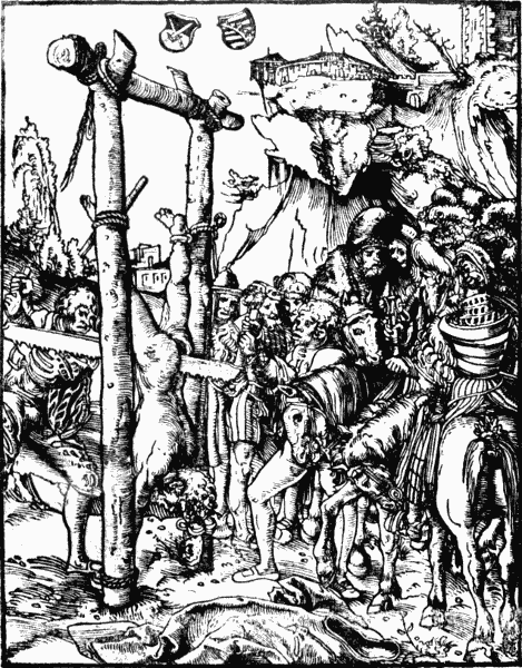 Außer dem Propheten Jesaias (Seite 30) wird der Apostel Simon — nicht zu verwechseln mit Simon Petrus — mit der Säge dargestellt, ja, er ist auch der Schutzpatron der Säger, denn es wird von ihm berichtet, daß er auf einer Missionsreise in Persien von fanatischen Priestern lebendig in Stücke zersägt worden sei[45]. Der große Meister Lucas Cranach der[S. 37] Ältere hat 1539 in einer Serie »Das Symbolum..... der zwelff Aposteln«[46] den Martyrertod des Simon grausig dargestellt (Seite 38).