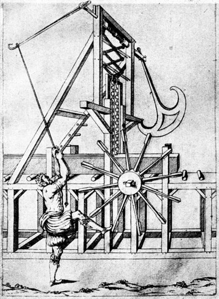 Ein selbsttätig arbeitendes Sägewerk mit Wasserkraft wird von dem um 1245 wirkenden französischen Ingenieur Wilars entworfen (unten). Bei der Skizze steht nur vermerkt: »Auf diese Art macht man eine Säge, um selbsttätig zu sägen.« Um die Skizze besser verständlich zu machen,[S. 25] habe ich Buchstaben eingefügt: a stellt den Bach dar, der das unterschlägige Wasserrad b treibt, auf dessen Wellbaum die vier Daumen c sitzen. Diese drücken die Hebel d und mit ihnen die Säge e nieder, die durch den federnden Baum f wieder hochgezogen wird, g ist der in den Führungen h gleitende Balken, den das Zackenrad i gegen die Säge vorschiebt.