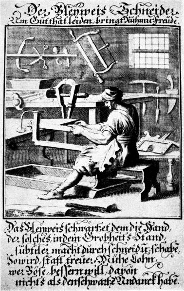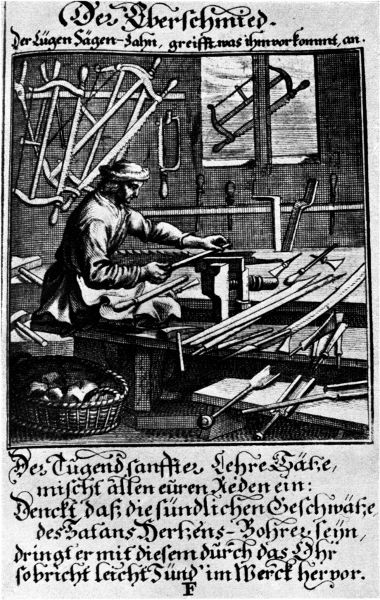 [67] Weigel, Abbildung Der Gemein-Nützlichen Haupt-Stände, Von denen Regenten ... Biß auf alle Künstler Und Handwercker, Regensburg 1698, S. 360. Später erschien der Kupferstich in: Abraham a Sancta Clara, Etwas für Alle / Das ist: Eine kurtze Beschreibung allerley Stands-, Ambts- und Gewerbs-Persohnen..., Würzburg, Bd. 2, 1711, S. 432.