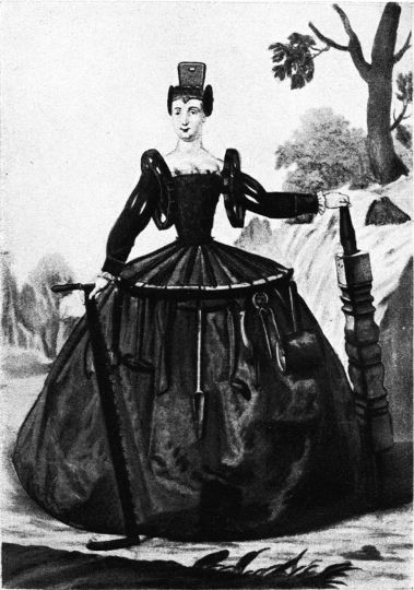 Eine prächtige Stickerei in Seide und Gold (Seite 25), die aus dem Besitz der Grafen von Champagne stammt, wird im Schatz der Kathedrale zu Troyes aufbewahrt[30]. Die Kleidung der Figuren läßt darauf schließen, daß dieses Stück, das wohl ein Geldbeutel oder Klingelbeutel gewesen ist, aus der Zeit von 1350–1400 stammt. Zwei Frauen sägen mit einer Rahmensäge ein menschliches Herz. Es soll sinnbildlich dargestellt werden, daß die Frauen den Männerherzen blutige Schmerzen bereiten. Rettend kommt aus einem Wolkengebilde eine Hand mit einem Beil, um die Säge zu zerschlagen. Vom Himmel her kommt also den irdischen Liebesschmerzen die einzige Rettung.