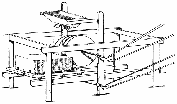Das römische Altertum kannte neben diesen verschiedenartig gezahnten Sägen für Holz die ungezahnte Säge für Stein. Plinius, der Verfasser der römischen Naturgeschichte, berichtet ums Jahr 77 unserer Zeitrechnung[22] über den Marmor: »das Schneiden geschieht durch Sand und nur scheinbar durch Eisen, denn die Säge drückt in sehr schmaler Linie auf den Sand, wälzt denselben durch Hin- und Hergehen, und schneidet so unmittelbar durch die Bewegung.« Das ist die gleiche Technik des Steinsägens, die wir noch heute ausführen.