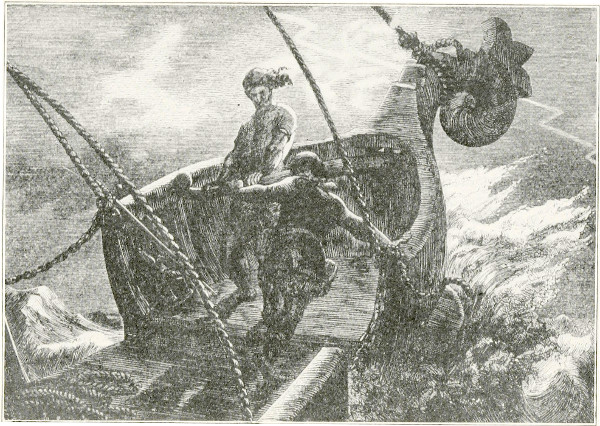 Away dashed the sledge with the speed of the whirlwind, the stout-hearted old king exulting in the motion and heeding not the entreaties of his wife; but swift as they flew, the stranger still outstripped them, circling about in wide curves or cutting figures on the ice. Meanwhile, false Ran, the spouse of the Sea-god, has marked what is passing above. She cleaves a broad fissure in the sea’s silvery roof, and into the up-foaming waves plunge horse and sledge. But swift as the wind flies the stranger thither. Fixing his steel shoes firmly in the ice, he seizes the horse by the mane and with a mighty jerk, pulls it and sledge together back on to the ice.