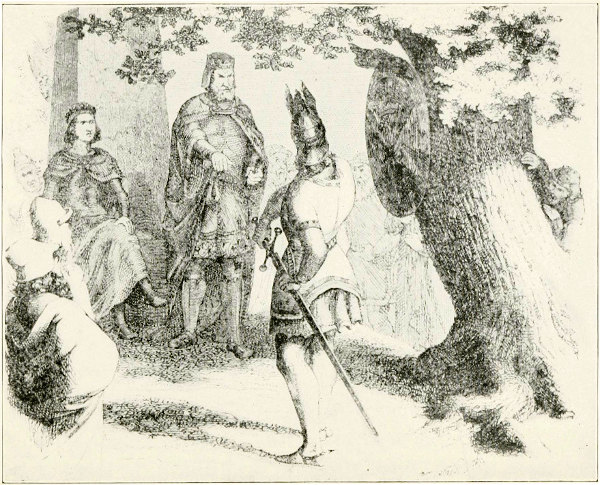 King Ring has fallen behind; old and feeble, he can no longer follow the lengthening chase, while beside him silent and thoughtful, rides his guest. At last they reached a rocky glen shut in by thick-clustering trees and thickets, and here the King dismounted from his courser, saying: