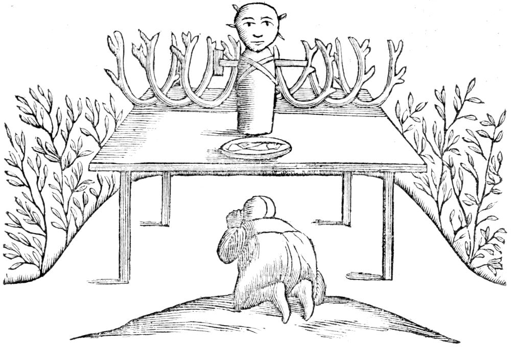When they perceive any one neer death, then if there be present any well disposed persons, and versed in the Christian Religion, they exhort him in his agonies to think of God and Christ. If they are regardless of Religion, they instantly abandon the sick person, carefull only about the funeral banquet, which they begin sometimes to celebrate before the person departing is quite dead. Steuchius confirms this by a Story; There was a rich Laplander named Thomas, who when he was taken with a dangerous fitt of sickness, so as to loose all hope of recovery, he summond before him his friends and acquaintance; they when they perceived him to be desperate, they hasted to the Victuallers that keeps the Inn towards Norway and Jamptland, and of him they bought Ale and spirit of Wine ready to[126] sacrifice over their friend, whilst he was alive: when they had spent a whole day in quaffing, they camme to the sick mans Hut, and by that time found him quite dead. This is an example of the latest date, that hath happened in these our daies, from whence we may learn how just and reasonable the complaints were, which were premised to the Charter of Gustavus Adolphus, concerning the Lapland School. Furthermore, it is customary if any die, of whatever distemper, all instantly forsake the Cottage where the departed person lies; for they imagine (which is elsewhere shewn) that there survives something of the deceased, such as the ancient Latins called Manes, and that that was not alwaies benign, but sometimes hurtfull: for this reason they are afraid of the corps of the deceased. And if the person departed were of the richer sort: they wrap his corps in a linnen garment, if a poor mean man, in a woollen tattered one, so as to cover over as well the head, as all the other parts of the body, this they call Waldmar. So indeed do they that are more observant of the Christian rites then ordinary there; as for the others, they cover their dead with their own vestments, and those too the best they had when alive, as N. Matthias Steuchius assures me by a Letter, and confirms it too by a late example that a person worthy to be credited, related to him by an Inhabitant of Undersaok, a near neighbour to Lapland. The body of the dead, saies he, they cover with the best garments he had alive, and shut it up in a Biere. They lay the corps so wrap’d up in a Coffin, or funeral Chest, which is done by one peculiarly intreated to undertake the employment, and who must receive of the nearest kinsman to the deceased person a ring of Alchimy, and wear it fastned to his right arm. The reason of so tying this ring is, because they beleive it to be a preservative against the harm the Manes of the deceased person may otherwise bring upon them, for this reason he is fain to wear this same ring till the Burial be over, I suppose, because then they think the ghost may be more quiet, which is the ancient superstition as well of Greeks as Romans. The Coffin is usually made of the hollowed trunk of a tree, when they have not wherewithall to make a Coffin, as is common with them that dwell in the barren Mountains near Norway, they lay the corps of the deceased on a Carr or Sledge, which they call Akia, instead of a Coffin. The place of their Buriall in ancient times, before they turned Christians, was the first convenient place they met withall for that purpose, especially a Wood. As for them that dwell at a considerable distance from the Church at this day, they leave not off the custom of burying them any where where they first light, with the Sledge too, especially if there are only bare Rocks, and no Trees to be seen. Others on every side beset the Sledge with the corps too with stocks of Trees, both above and below, on each side, so as that it may not contract filthiness or moulder, nor the corps be torn in pieces, or devoured by wild Beasts.