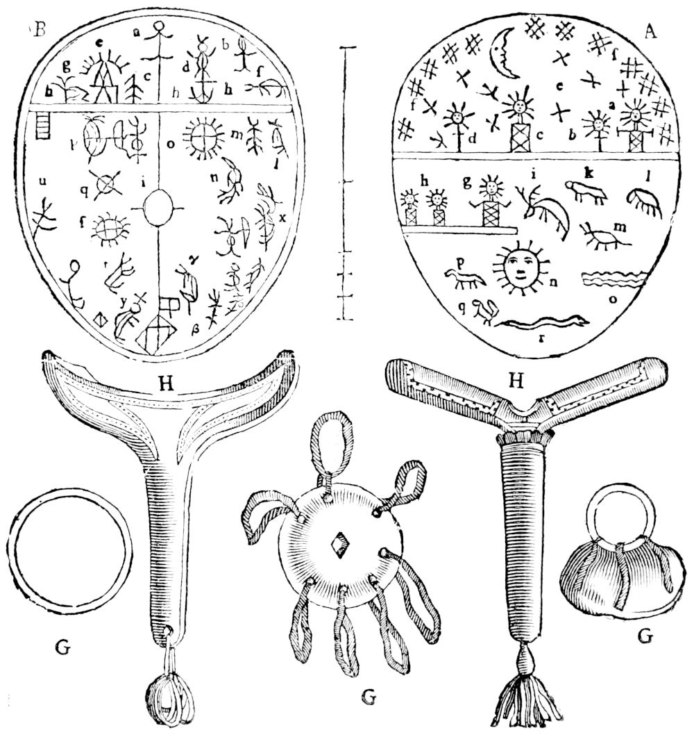We have shewed in the foregoing Chapter that there were three principal Gods worshipped by the Laplanders; the first is Thor, signifying thunder, in the Swedish Dialect called Thordoen, by the Laplanders themselves Tiermes, that is any thing that makes a noise, agreeing very well with the notion the Romans had of Jupiter the thunderer, and the God Taramis, which I have treated of in the History of Upsal. This Tiermes or thunder they think by a special virtue in the Sky to be alive; intimating thereby that power from whence thunder proceeds, or the thundring God, wherefore he is by them called Aijeke, which signifies grand, or great-grand-Father, as the Romans saluted their father Jupiter; and the Swedes their Gubba. This Aijeke when he thunders is by the Laplanders call’d Tiermes, by the Scythians, Tarami, and by the Swedes, Tor or Toron. This Tiermes or Aijeke the Laplanders suppose to have power over the life and death, health and sickness of man: and also over the hurtfull Demons who frequent Rocks and Mountains, whom he often chastises, and sometimes destroies with his lightning, as the Latins fanci’d their Jupiter to do, for which end they give him a bow in his hand to shoot the Demons with, which they call Aijeke dauge: also they give him a mallet, which they call Aijeke Wetschera, to dash out the brains of the said evil spirits. Wherefore because the Laplanders expect so many blessings from their Tiermes, and believe he bestows life on them, and preserves their health, and that they cannot die unless it be his plesure, and drives away the Demons, which are prejudicial to their hunting, fowling, and fishing, and never hurts them but when their offences deserve it: therefore he is to be worshipped in the first place. The next of the principal Gods is Storjunkare, which tho it be a Norwegian word, Junkare in that language signifying the Governor of a Province, yet is it used by the Laplanders now; tho perhaps it was not in use till some of them became subjects to Norway. Certain it is, that this is not the only name of that God, for he is also called Stourra Passe (i.e.) Great Saint, as appears by a Hymn which is sung at his Sacrifices. His name they reverence very much, and pay him frequenter, if not greater devotion then other Gods, for they suppose him to be their Tiermes his Lieutenant, and as it were Royal Prefect, adding Stœre, which signifys greater for distinction sake. Now they worship Storejunkar, because they think that they receive all their blessings thro his hands, and that all beasts and Cattel, are subject to his will, and that he governs them as Tiermes doth men and spirits; wherefore he can give them to whom he will, and none can receive them without his pleasure. These beasts therefore supplying the Laplanders with meat and clothes, it may easily be imagined how ne[38]cessary they held it to worship Storjunkare. And these are the two peculiar Gods of the Laplanders, whereof one hath the dominion over men, the other over beasts; one bestows life, the other all things required to the sustaining of it. Tornæus saies they report of him that he hath often appeared to Fowlers or Fishers in the shape of a tall personable man, habited like a Nobleman, with a Gun in his hand, and his feet like those of a bird. As often as he appears standing on the shore, or in the ship by them, they say he makes their fishing successful, and kills birds that happen to fly by with his Gun, which he bestows upon those that are present. It is reported that a Laplander being to guide one of the Kings Lieutenant, when he came over against a mountain where Storejunkar was supposed to dwell, he stood still, and setting the helve of his Ax down upon the Ice, turned it round, professing that he did it in honor of their munificent God, who dwelt there. And tho there is mention made but of one mountain where the Laplander performed this ceremony, yet we may suppose he would have don it oftner, if there had happened to be more hills in the way. But perhaps this distinction of name is used by the Laplanders which border upon Norway, especially in Lulalapland, from his habit and clothing; and because he used to appear in another dress to them of Lapponia Kiemensis and Tornensis, therefore they did not worship him under that name, but by the common appellation of Seita, from whom they believed that they receive the benefits of hunting, fishing, and fowling.