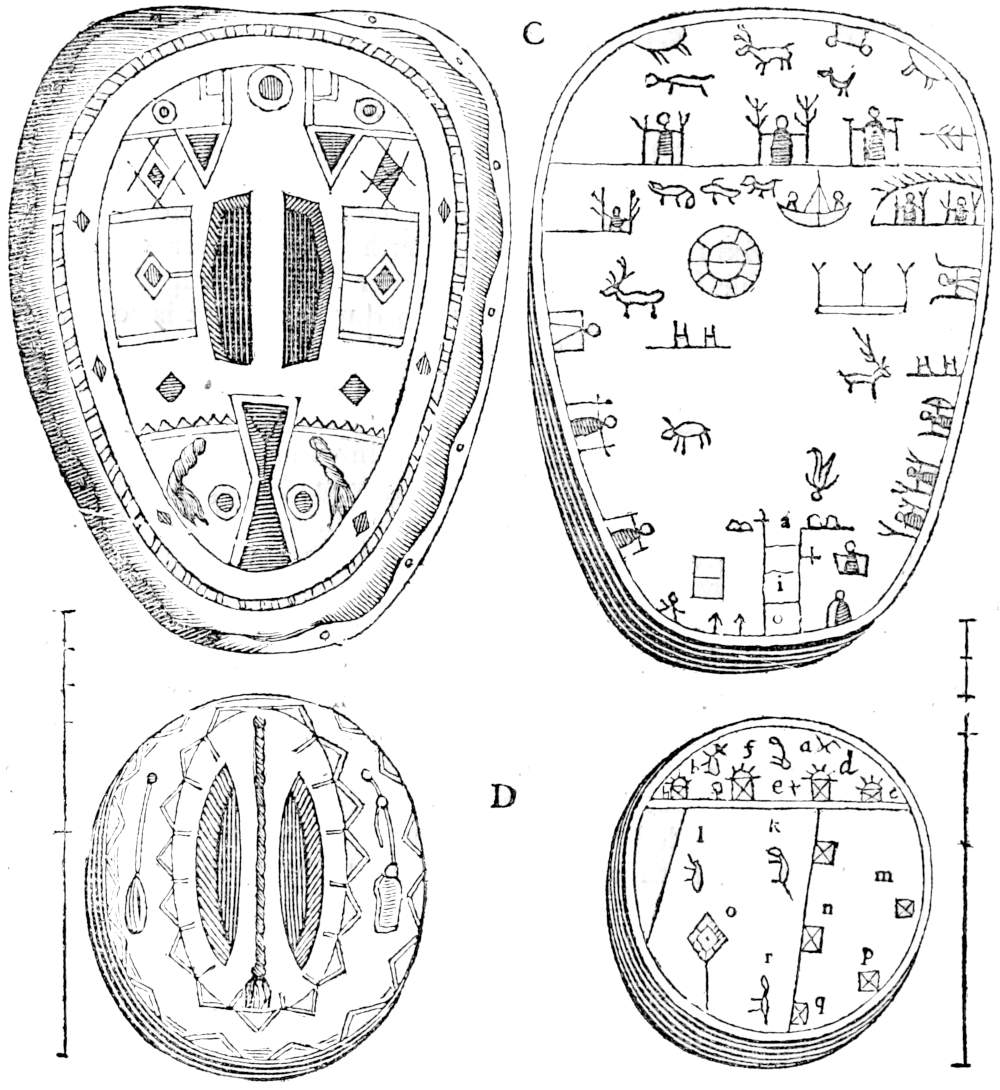 They have also one Art more worth taken notice of, as ingraving flowers and several Beasts in bone, into which they cast several plates of Tin, and with these figures the men and women adorn their girdles and other things: the same way they make their molds for casting bullets. They make instruments for all emploiments, as Cookery, &c. those for hunting are usually made of bone, and others are commonly adorned with it. Zeigler mentions tubs, which are rather cups, or vessels cut out of a stump of a Tree, as traies are: and Wexionius mentions other vessels made of bark, but I forbear to speak of any more, only I shall add that they learn their art not from masters but their fathers according to their capacity.