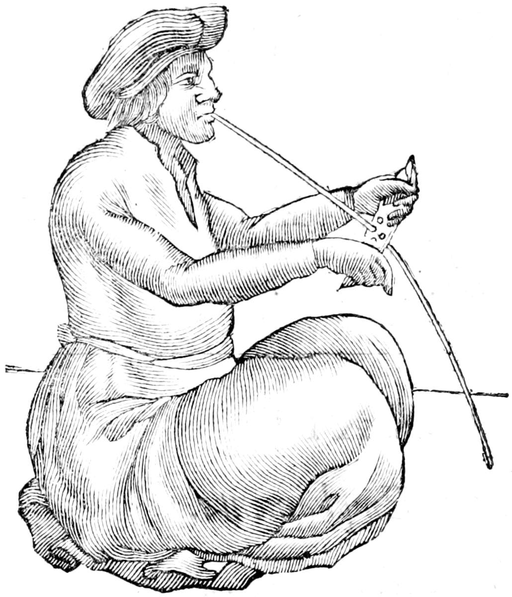 Having run thro the mens emploiments, the womens are next to be considered. Two trades are most peculiar to them, as doing the work of Taylors and Shoomakers, for they make and mend all the Clothes, Shoes, Boots and Gloves; and they have a third the making all those things that join the Rain-deer to the sledg, as collars, traces, &c. in order to which they learn subservient arts, as making thred, which is commonly of Rain-deers nerves, because they have no flax: of this sort I have some by me. Olaus Magnus saith ad indumentorum usum, for the making of shirts, which made Lomenius believe the women wove this thred into cloth, who I perceive in his short description of Lapland, hath very closely followed his words more then his sense. In the making of their thred, which is of about 3 ells long, the extent of the Rain-deers nerves, they first cleanse the nerves, then having cut off all the hard parts, they dry, and hatchell them, and lastly mollify them with fishes fat. Besides this they spin wool for swadling clothes, and Hares fur, with which they knit caps, as in other parts of Europe they do stockins with four knitting needles, which art the Germans call stricken. These Caps are as soft as Swans down, and extremly warm. In the same manner they make Gloves, which are very beneficiall to them in the cold. The work of their fillets is very curious, for they put in them many figures, as you may see at the end of the foregoing Chapter, at the figure I. The fourth trade is their covering thred with tin, which first they draw into wire by pulling it thro little holes in horn with their teeth, which holes they fill half up with bone, that the tin may be flat on one side, and fitter to be put on thred. The picture of a woman drawing wire you have in the next page. Then they put it upon the nerves by the help of a spindle, which doth so twist them together that they seem all tin, and when they have done, they wind it about their head or foot, least it should entangle and be spoiled. And this is their way of making thred of tin, as in[104] other Countries of gold and silver, the chiefest use of which is in adorning their clothes after the way of Embroidery, which is the womens fifth art. Ziegler adds to this faciunt vestes intextas auro & argento, that they interweave in their clothes gold and silver, which I cannot believe, because they do not do so now, and whatever is spoke of the mettal, they weave neither linnen nor woollen, but buy it from the Bothnian or Norway Merchants: so then they do not weave this thred into their garment, but embroider them with it. Thus they adorn all their vestments, as gowns called Muddar, boots, gloves and shoes, and she that doth it neatest, is preferred before other women, and had in greater estimation. They do not immediately put this upon the fur of skins, but lists of blew, green, or red woollen cloth.[105] Their gowns are embroidered about the neck, sleeves, breast, and sides; gloves about the tops, shoes; instep and toes; boots, about the knees; in which work they commonly picture; Stars, Flowers, Birds, Beasts, especially Rain-deers: and to make their clothes more glorious, they set them with spangles, fillets, points, and knots of this thred, and wear upon their head shreds of diverse colored cloth, the pictures of all which you have in the former Chapter, Boots F, Gloves G, Shoes H. The Rain-deers harness they embroider in the same manner.