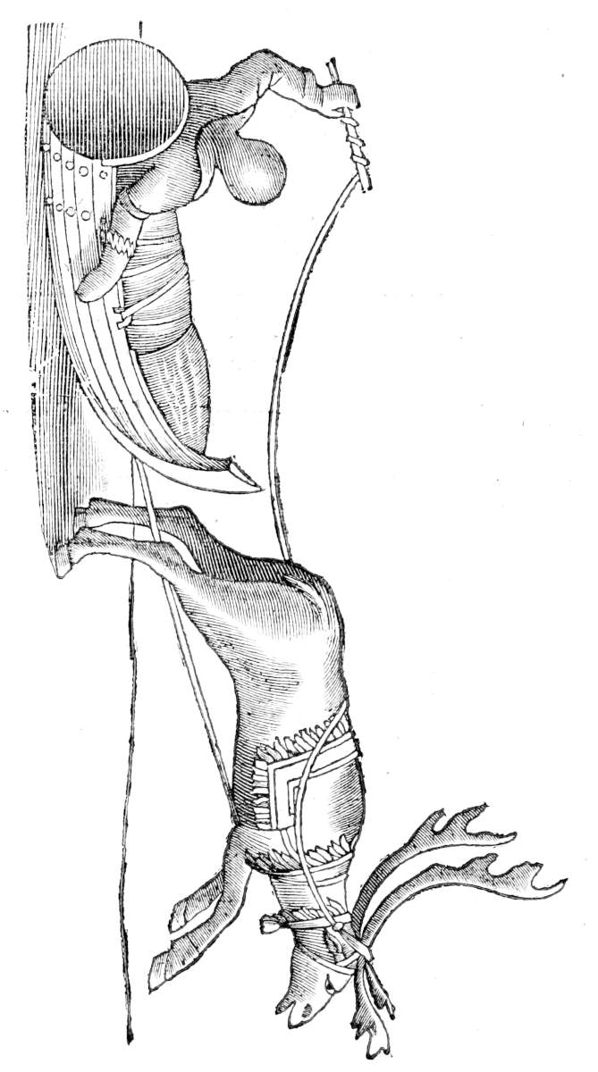 The rocking the infant in his cradle, follows next, whereby they get him a sleep. Their Cradles are made of the stock of a tree hollowed, like a boat: these they cover with leather, and at the head they erect an arched kind of roof, of leather likewise. In such a cradle they lay & tie in the Infant, without any linnen clothes or sheets, instead of which they lay him on a sort of soft moss, of a red color, which they dry in Summer, and have great plenty of it. When the Infant is to be rocked, they let the cradle hang by a rope from the roof of the hut, and by thrusting the cradle and tossing it from one side to the other, they lull him a sleep. They use likewise to please their young children with some certain baubles, for at their cradles they tie some rings of Alchamy, to make a noise and clinking. To these rings which serve instead of rattles they moreover add some emblems, wherewith their children may be timely admonished of their condition and future duty. If it be a boy, they hang up at his cradle a bow and arrows, and a spear made very artificially out of Rain-deers horn, whereby they signifie, that their children must diligently practise to be expert and ready in using the bow and spear. If it be a girle; the wings, feet, and beak of a white Partridge, which they call Smæripa, and is call’d Lagopus having feet like the feet of an hare, thereby implying, that their Daughters must carefully learn to be cleanly, and like those birds nimble and active. As soon as the children come to some age, they instruct them in all necessary arts, the Fathers the boies, the Mothers the girles, for they have no School-masters among them, but each person is his own childerns Master, and they are so far put on by their parents as to be able to perform any works in use among them. Their boies they cheifly teach the Art of Shooting, and hitting marks with an arrow, because in old time they were necessitated to get their living by the help of bow and arrows, whereas the greatest part of them maintain themselves by hunting, and therefore when they have practised never so little the use of the bow, the boies victuals are kept from them, till they can[124] hit a mark with an arrow, and as it was the custom anciently among the Baleares, and so now among the Laplanders, their boies earn their food every day by their dexterity in shooting, and thereby at last they prove most excellent marks-men. Olaus Magnus makes mention of this their practice, and wonderfully extolls their dextrousness herein, and avers that he himself has seen some of them who could exactly hit a farthing or a nedle, set at such a distance off as would just let them see it. On the boies, that they may take more care to hit the mark, when they have hit it, they bestow a white girdle, wherein they take huge delight, and sometime a new bow. But as the Laplanders do look to their children in time to teach them arts requisite to get their living, so also to provide them means to maintain themselves withal, where it will not be impertinent to mention, that tis a custom with them to bestow upon their infant a female Rain-deer, soon after its birth or Baptism, if it be of female Sex, and upon the horns of it they ingrave her mark, so to prevent all controversies or quarrels, that may arise concerning her right. She receives likewise another, when she cuts her first tooth. Which they call Pannikeis, that is, the tooth Rain-deer. John Tornæus writes as if these gifts were given only by women. The Woman saies he, that first spies a tooth in his mouth, is fain to honor him with a present of a Rain-deers Calve. This custom might probably have its rise thus, because, when the infants have gotten teeth, they have need of more solid meat, therefore they stock them with Rain-deer as being their cheifest food. That Rain-deer then, and whatever encrease comes of it, are preserv’d to the future uses of the child, as may appear by what we have elsewhere said, in the Chapter of their marriages, and so likewise of the other Rain-deer which parents give the child besides, for tis usual among them to superadd one to the former, and this they call Waddom, that is, the given one. And this is the chief care of the Parents towards their children, but if they die, instead of them are substituted Guardians, as among other nations, out of their nearest kindred, who manage all these affairs for them.