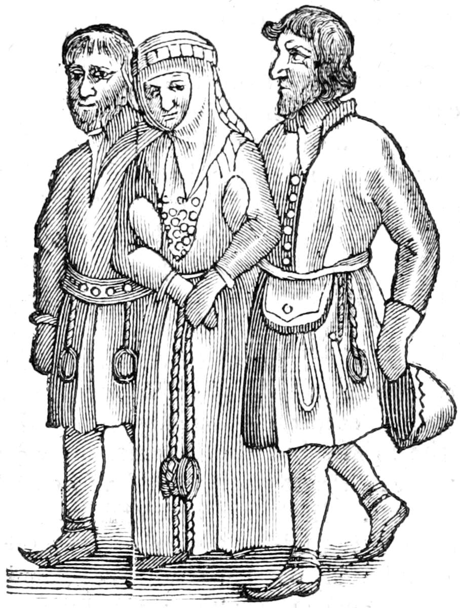 The Bridegroom is bound to present the Father with a silver cup, to drink in; this is the first of those they call Stycke. The second is a large Kettle, either of Copper or Alchymy. The third, a bed or at least hansom bedding. The presents for the Mother are, first a girdle of silver, secondly a Robe of honor such as they use to call Vospi. Thirdly a Whisk, which they wear about their neck, and let it hang down to their brest, interlaced all about with bosses of silver, and this they call Krake. These are the presents for the Father and Mother: besides he bestows upon the Brothers, Sisters, and all the near kindred, silver spoons, silver bosses, and some other such kind of things of silver, for each of them must be presented with some gift by the Bridegroom, if he mean to obtain his Bride. These are the presents, which the Bridegroom is more especially bound to make to his Father and Mother in law that are to be, and the rest of the kindred. And he makes them in his father in laws hut, in the sight of all there. The day following the wedding is celebrated, first by the ceremonious joining of the Priest in the Church, afterwards by a set dinner. The new Wife together with the Bridegroom walk along, both dress’d in the best clothes they can procure at their own charges. For ’tis looked upon among them as unhansom to make use of the borrowed cloths of others, unless it be wool as I have elswhere shown. They take saies Tornæus so great pleasure in good cloth of what ever color, that as far as their patrimony will permit, they procure their extraordinary apparel and festival Garments of that kind: who declares expressly that their festival apparel, or that which they wore on more solemn daies, was not of skins but rich cloth. These Garments the Bridegroom girds up with a silver girdle, but the Bride first looses her hair: and the fillet wherewith she bound it up together before, she gives to the Virgin that is next a kin to her: afterwards, on her bare head, and loose hair she puts a kind of a silver fillet gilt over, or two, such as is the womens custom to wear at o[117]ther times besides, instead of a Garland or Coronet, so that by how much this fillet is looser, then to environ only her head; so much it hangs down the more behind: likewise about her middle they put on a silver girdle. This is the Brides apparel, unless that sometimes they put upon her head something of linnen, instead of a veil, which at other times the women use when they have a mind to make themselves extraordinary gallant, for as for what appertains to their garments, we have before observed, that both the Bridegroom and Bride wear their own, and those their best, and such as on festival daies they deck themselves withal. We have shown in another place, that the womens were called Volpi, and were made either of wool, or the richer sort of cloth, so that neither about this does Olaus Magnus in his place a forecited, concerning the Lapland Bride, sufficiently agree with their custom at this day. They set the Bride saies he, apparell’d in Ermins and Sables skins on a Rain-deer. At this day both dress’d very fine are carried to the Church or Priest, to be joined in Marriage; this was not the custom in old times, if we give credit to Olaus Magnus, for then they were joined at home, not by the Priests but the Parents, his words are in Lib. 4. Cap. 7. in which place he treats of the Laplanders weddings, as the Title of the Chapter informs us. In the presence of friends and kindred, the Parents solemnly ratifie their Childrens Marriages, and that too by the striking of fire with a flint and steel, particularly there he makes the Parents joining them, and adds moreover the manner, viz. by fire striken out of a flint, which without doubt as some other things, he cull’d out of Zeigler, but as for the parents doing it, Zeigler has nothing of that, the manner of their joining he explains in these words, They ratifie their Marriages, and begin them in a ceremony of fire and flint, so pat a conjugal mysterie, that they think nothing can be more agreeable, for as the flint conceals within it self fire, which by concussion breaks forth, so in both sexes there is life hid, which by the mutual coupling of marriage is propagated at last to be a living ofspring. And just so Olaus has it, so that there can be no doubt made but that he followed Ziegler. When they arrive near the Church, they observe in their procession a certain order, first walk the Men, the Women follow. The Men are led up by a Laplander, whom they call Automwatze, or foreman, then follows the Bridegroom, after him the rest. Some number of Virgins lead up the womens company, after them comes the Bride led between a man and a woman, next to her follow the rest of the women. Tis here to be observed that the Bride like one strugling against it, and endeavoring the contrary, is dragged along by the man and woman that are to wait upon her, and would seem to admit of her marriage with great unwillingness and reluctancy, and therefore in her countenance makes shew of extraordinary sadness and dejection: so afterwards in the Church they are joined together by praiers and benediction according to the Christian rite. After the same manner does John Tornæus relate this busines, only that he saies the Bride is led by two men, her Father and Brother, if alive, or otherwise by her two next Kinsmen. The portraicture of the Bride in her wedding apparel, and with her two leaders you have in the next page. After the solemnity of the marriage is ended, there follows a wedding feast, that is made in her Parents hut, and as for the provision, each of the persons invited contributes his share of the victuals, tho[118] they bring it not thither just then, but the day before: when the Bridegroom distributes his presents to the Brides parents and kindred, then every one brings his victuals that will be serviceable to the feast. But because the meat they bring is ordinarily raw, they del