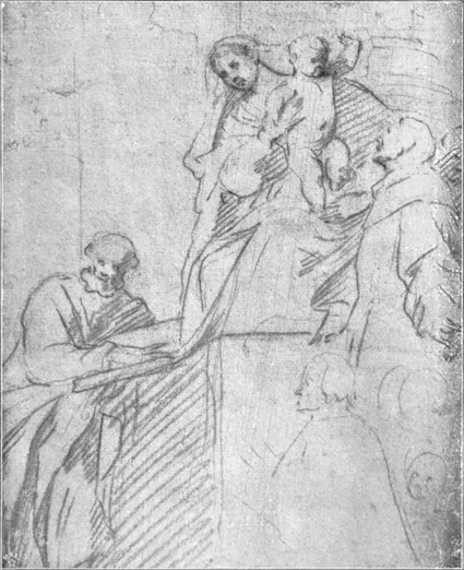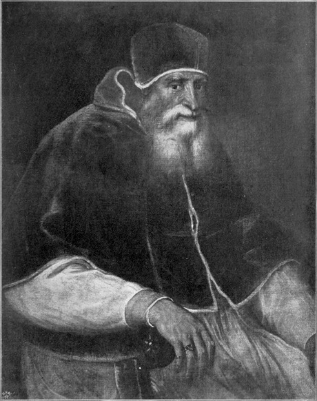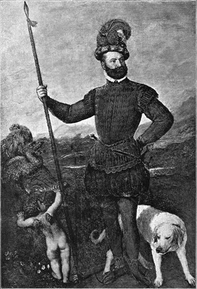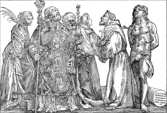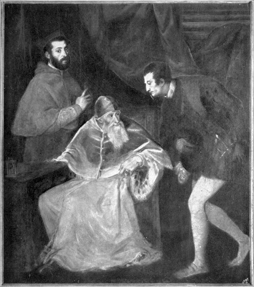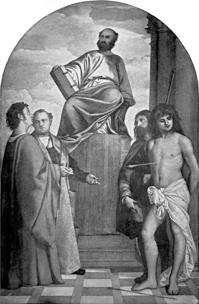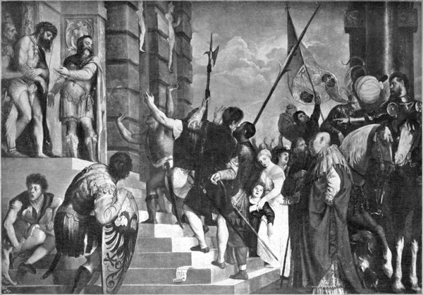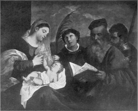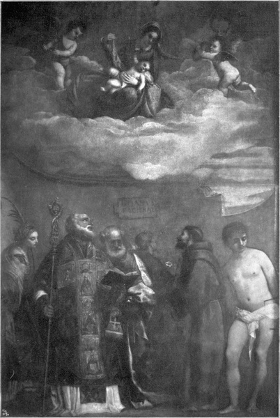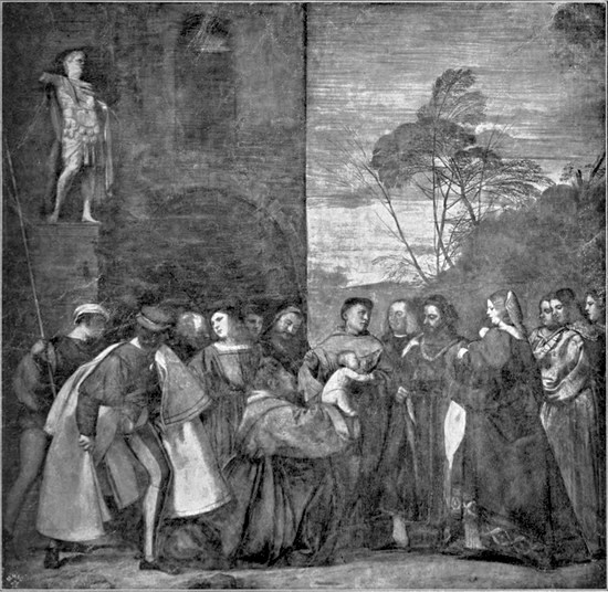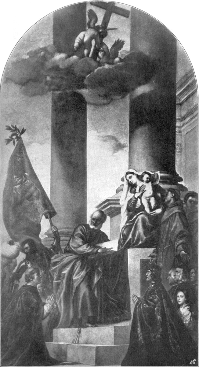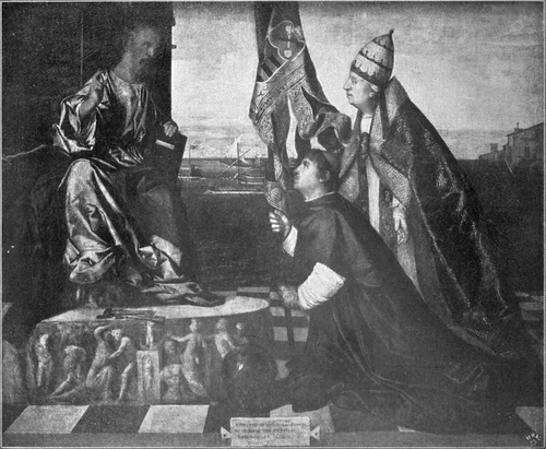 Das erste erhaltene Gemälde Tizians, das eine einigermaßen sichere Zeitbestimmung zuläßt, befindet sich im Museum zu Antwerpen. Es stellt den venezianischen Prälaten Jacopo Pesaro vor, der mit der Kriegsfahne Papst Alexanders VI. in der Hand vor dem Throne des Apostels Petrus kniet und diesem von dem Papste selbst empfohlen wird (Abb. 1). Die Zeitereignisse, auf die dieses Gemälde anspielt, lassen auf seine Entstehung schließen: frühestens im Jahre 1501, in dem Jacopo Pesaro zum Befehlshaber einer gegen die Türken ausgerüsteten päpstlichen Flotte ernannt wurde; und schwerlich nach dem Jahre 1503, in dem Alexander VI. starb.