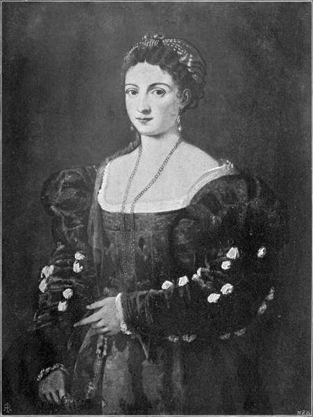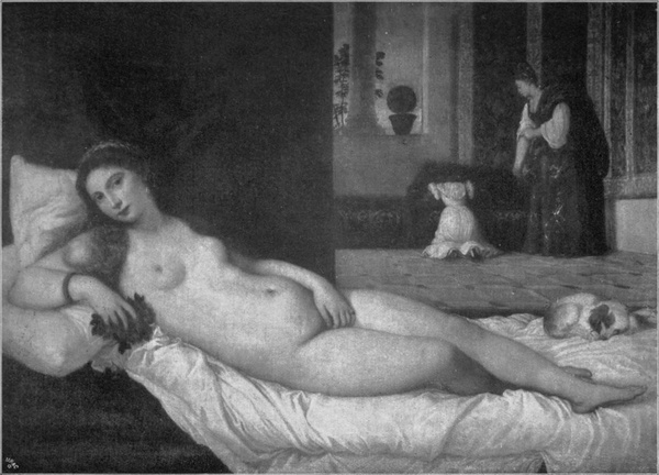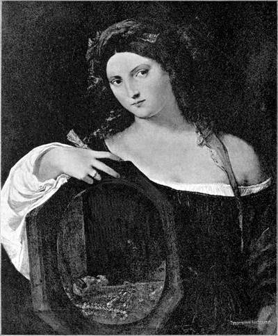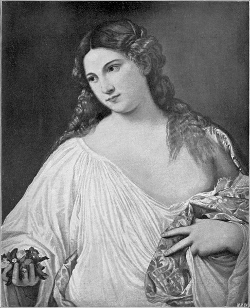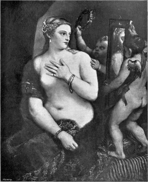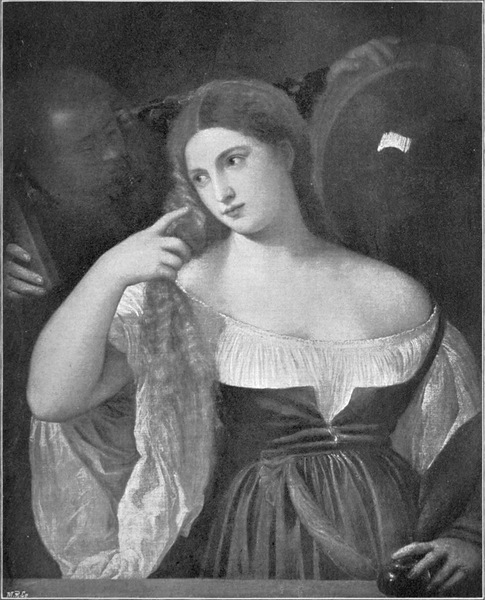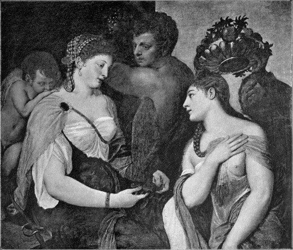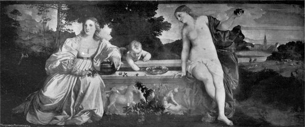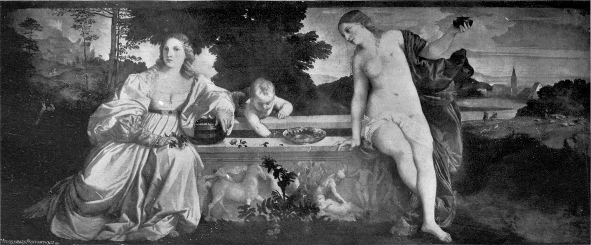 Ein Zeitraum von zwei Menschenaltern liegt zwischen diesem Bilde und der in der nämlichen Sammlung befindlichen Liebesallegorie der zwei Mädchen am Brunnen. Die auffallendsten Unterschiede zeigen sich in der Art, wie die Gewänder gemalt sind. Hier hat der Jüngling Tizian noch in der glatten, die Einzelformen sauber zeichnenden Behandlungsweise des XV. Jahrhunderts gemalt. Dort zeigt der Greis, der achtzig Jahre hindurch Auge und Hand geübt hat, jeden einzelnen Pinselstrich, und er läßt die Umrisse in den ineinander gesetzten Strichen verschwimmen; aber indem er dies thut, bringt er die Formen nur desto reizvoller zur Geltung für den das Bild aus dem richtigen Abstand betrachtenden Beschauer; so schreibt er dem XVII. Jahrhundert seine Malweise vor. Hier wie dort aber lebt das gleiche Farbengefühl; wenn in dem Alterswerk auch nicht mehr in so heller Pracht wie in der Jugendschöpfung, so doch noch freudig glühend.