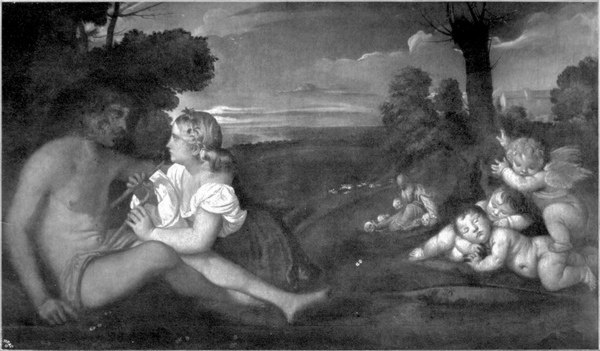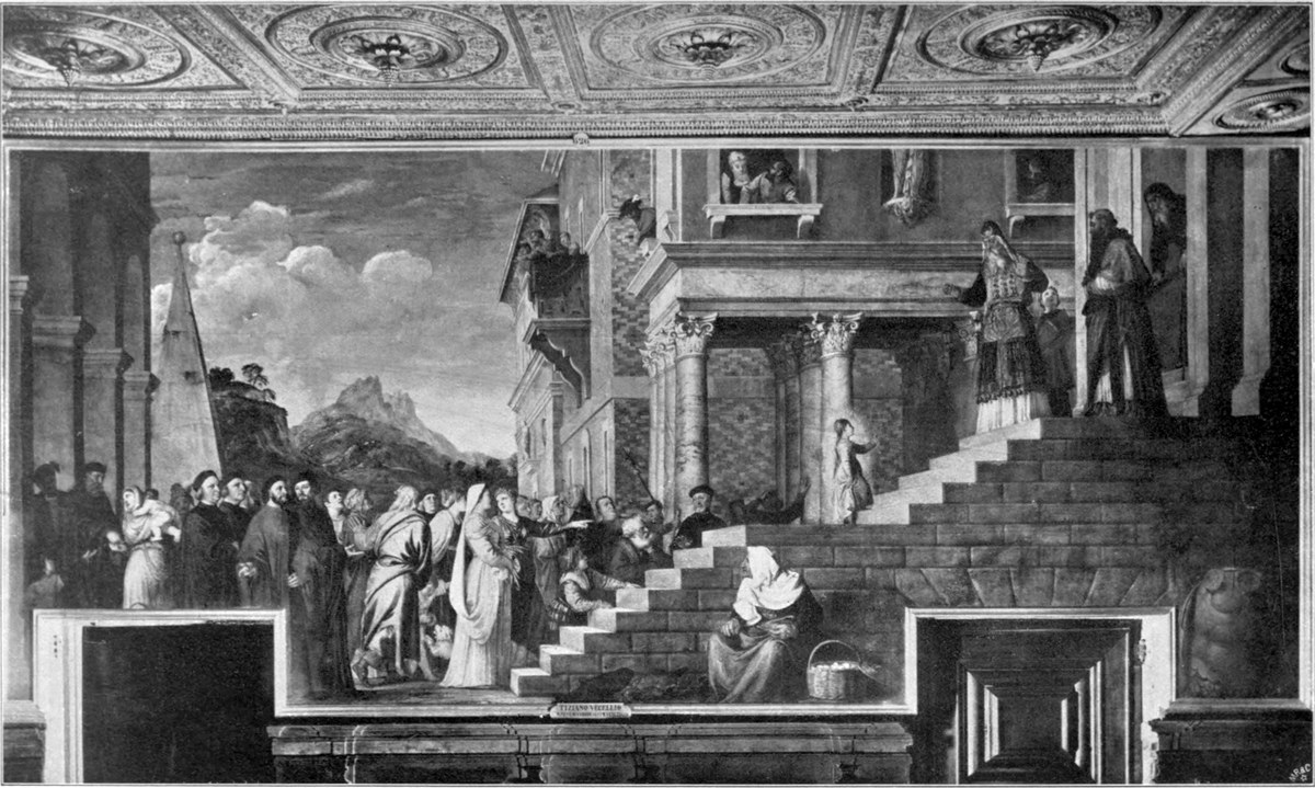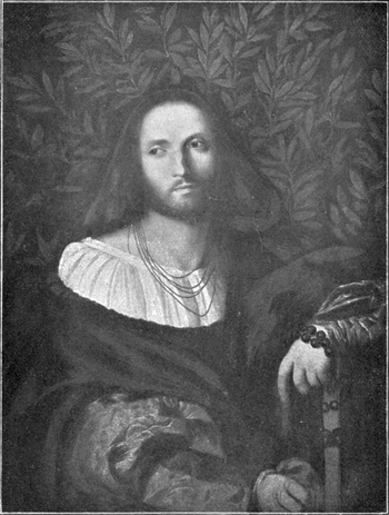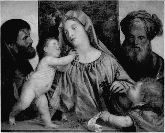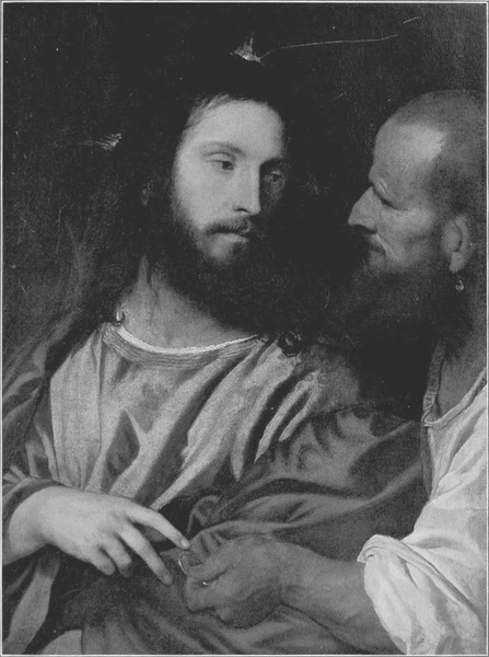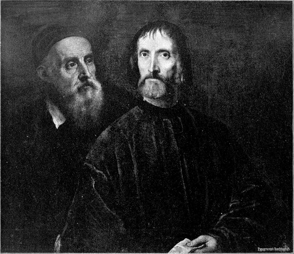 Der Altmeister Giovan Bellini, der Lehrer vieler vortrefflichen Künstler, war der eigentliche Begründer der besonderen venezianischen Malerei mit ihrer gesunden Kraft und Schönheit und ihrer herzerfreuenden Farbenpracht. Auch Giorgio Barbarelli, der unter der Benennung, die ihm seine Freunde gaben, Giorgione (der lange Georg) der Nachwelt bekannt geworden ist, war sein Schüler. Giorgione war Tizians Altersgenosse. Er war ein ausgezeichneter Künstler und ein Maler von allererstem Range. Er fühlte in Farben. Sein im Louvre befindliches Gemälde zum Beispiel, das mit dem Titel „Konzert im Freien“ bezeichnet zu werden pflegt, ist eins der vollkommensten malerischen Kunstwerke, die es gibt. Deutschland besitzt ein treffliches Werk von ihm in dem vor kurzem für das Berliner Museum erworbenen Bildniskopf eines jungen Mannes. Giorgione starb 1511 im Alter von vierunddreißig Jahren als ein berühmter Mann. Es hat nichts Befremdliches, wenn der junge Tizian von einem Gleichalterigen, der solch eine hervorragende Begabung besaß, zu lernen sich bemühte. Tizian scheint kein Wunderkind gewesen zu sein, sondern vielmehr sein außerordentliches Können durch arbeitsamen Lerneifer sich erworben zu haben. Auch von dem um zwei oder drei Jahre jüngeren Mitschüler Jacopo Palma, gewöhnlich Palma Vecchio („der Alte“) zum Unterschied von einem gleichnamigen späteren Maler genannt, einem Meister in der Schilderung blühender Frauenschönheit, hat Tizian vieles gelernt. Man braucht darum die Selbständigkeit seiner Kunst nicht geringer zu veranschlagen. Daß unter jungen Leuten, die in gleichen Verhältnissen gleichen Zielen zustreben, einer von dem anderen annimmt, ist nur natürlich. Auch erklärt der Umstand, daß in der Schule Bellinis mehr als irgendwo anders zu jener Zeit nach dem Leben gemalt wurde und daß daher die nämlichen Modelle verschiedenen Malern dienten, manche Ähnlichkeiten. Jedenfalls hat Tizian, der auch den Palma überlebte, später diesen sowohl wie den Giorgione übertroffen.