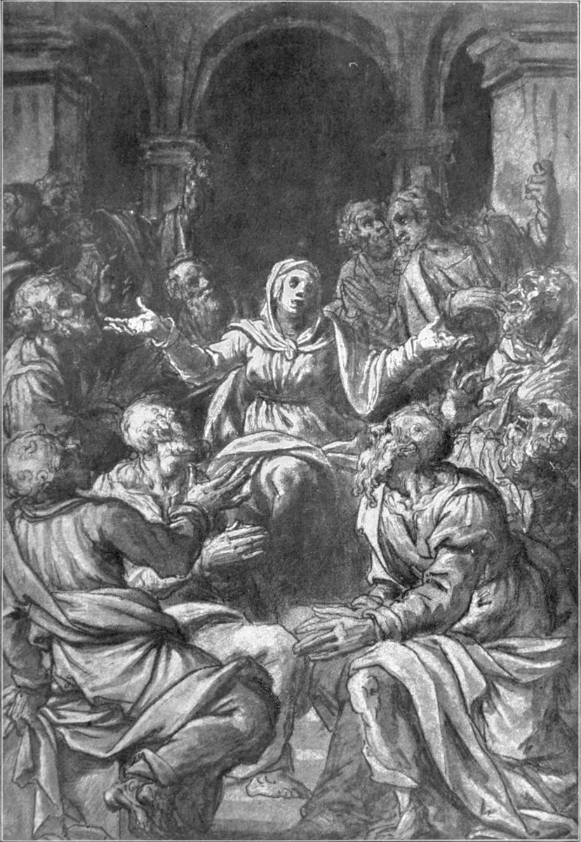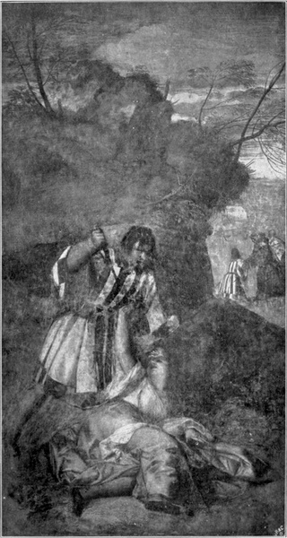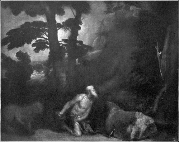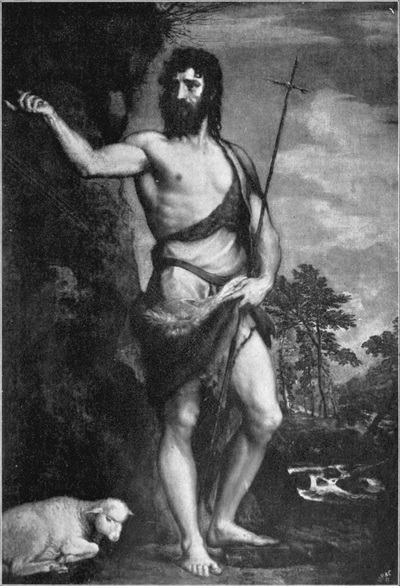 Vor der Vollendung dieses großen Gemäldes, das den Meister sicher mehrere Jahre hindurch beschäftigte, entstand ein kleineres Altarbild, das im Jahre 1557[S. 133] als etwas Neues in Venedig besprochen und bewundert wurde. Das ist das jetzt in der Akademie befindliche großartig erdachte Bild des Täufer Johannes, der als der Prediger in der Wüste aus der Felsenwildnis hervortritt und mit strengen, glühenden Augen zu den Beschauern redet (Abb. 103).