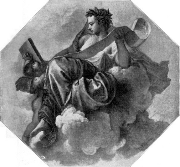 Außer den beiden Altarbildern besitzt Venedig noch ein ausgezeichnetes Dekorationsstück von Tizian aus derselben Zeit. In der von Sansovino, einem der liebsten Freunde des Meisters, erbauten Bibliothek von S. Marco wurde im Jahre 1556 mit der Ausschmückung des großen Saales durch Freskomalereien begonnen. Tizian hatte als Preisrichter dem jungen Veroneser Paolo Caliari als dem Sieger im Wettbewerb um diese Aufgabe eine goldene Kette überreicht. Während dieser hier arbeitete, konnte der alte Meister es sich nicht versagen, in dem vor jenem Saal gelegenen Eingangsraum, der im übrigen nur mit architektonischer Dekorationsmalerei geschmückt wurde, das Gerüst zu besteigen und in das achteckige Mittelfeld der Decke die in den Wolken thronende Gestalt der Weisheit zu malen. Als ob man sie draußen in der Höhe sähe, ist die mit wunderbarem Geschick in das Achteck hineinkomponierte Figur in starker Verkürzung von unten dargestellt. In ein weißes Untergewand und ein um die Beine geschlungenes gelbgrünes Obergewand gekleidet, das lorbeerbekränzte Haupt von einem gelben Schleier umwallt, lagert sie in erhabener Ruhe auf dem Wolkensitz, mit einer entfalteten großen Schriftrolle in der einen Hand, und mit der anderen eine Tafel berührend, die ein Flügelknabe ihr entgegenhält. Dieses Deckenbild ist ein in seiner Art klassisches Werk: so groß und schön im Gedanken und in den Formen, wie dekorativ wirkungsvoll als Raumfüllung (Abb. 105).