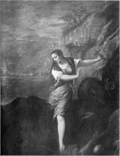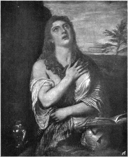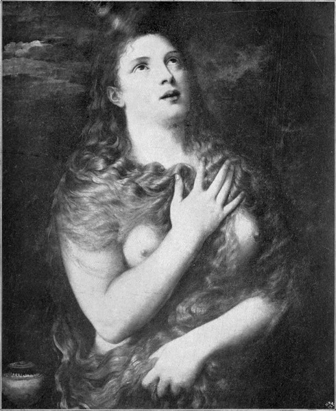 Das erwähnte Magdalenenbild wurde Anfang Dezember 1561 abgeschickt. Sein Verbleib ist nicht nachzuweisen. Man darf annehmen, daß es übereinstimmend gewesen ist mit der aus dem Nachlaß des Meisters stammenden ausdrucksvollen Halbfigur in der Ermitage zu Petersburg (Abb. 107). Von der Beliebtheit dieser Darstellung legt der Umstand Zeugnis ab, daß Tizian dieselbe häufiger und unveränderter als irgend ein anderes seiner Bilder mit Beihülfe von Schülern wiederholt hat.