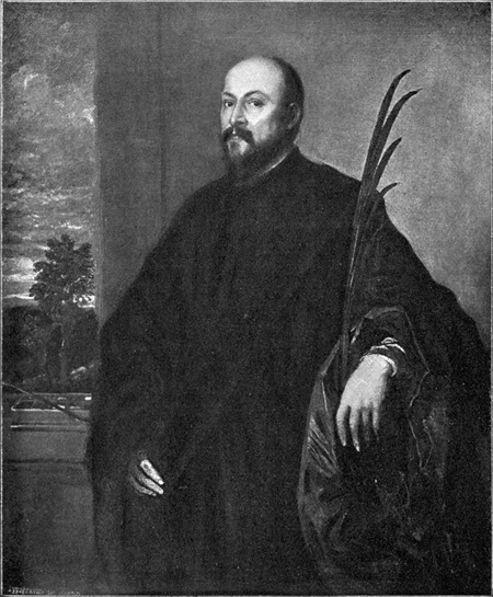 In ganzer Größe zeigt sich uns der alte Tizian noch da, wo er unmittelbar nach der Natur gemalt hat, im Bildnis. Die Jahreszahl 1561 liest man in der verstümmelten Inschrift eines in der Dresdener Galerie befindlichen Porträts eines schwarzgekleideten Herrn mit der befremdlichen Beigabe eines Palmenzweigs in der Hand (Abb. 108).