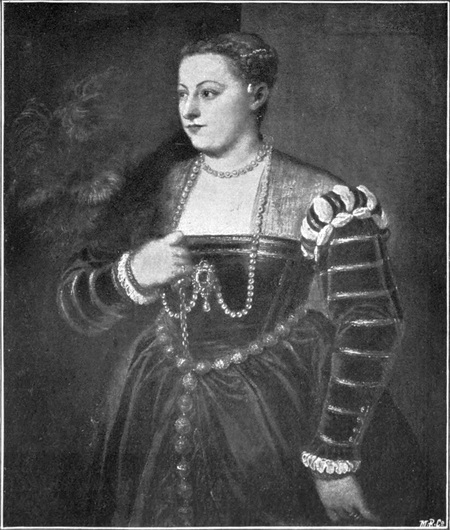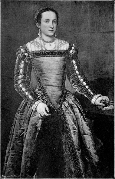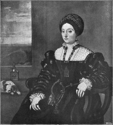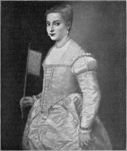 Das vollendetste Meisterwerk der Bildniskunst seines hohen Alters ist wohl das um dieselbe Zeit gemalte Porträt seiner Tochter in der nämlichen Galerie. Lavinia, die im Sommer 1555 von Cornelio Sarcinelli heimgeführt worden war, erscheint hier als eine zu kräftiger Fülle ausgereifte Frau mit einem würdigen Ausdruck in dem stärker gewordenen Gesicht, der in seiner Art ebenso ansprechend ist wie der Unschuldsblick in ihrem Mädchenbilde. Auf das in Venedig von der Mode verlangte Bleichen des Haares hat sie in dem Bergstädchen, wo sie jetzt lebte, verzichtet: das Haar zeigt statt des goldigen Blond seine natürliche kastanienbraune Farbe. Sie trägt ein mit weißen Seidenpuffen und mit Goldlitzen verziertes Kleid von grünem Sammet und hält einen großen Fächer aus Straußenfedern in der Hand; im Haar, an Hals und Brust und am Gürtel glänzen Perlen und anderes Geschmeide, ein Teil ihres Juwelenbesitzes, über den ihr Gatte dem Vater eine besondere Quittung zu der Empfangsbescheinigung über die ansehnliche[S. 139] Mitgift ausgestellt hatte. Kleidung und Schmuck, Fleisch und Haar sind mit einem braunem Hintergrund zu vollendeter Farbenschönheit zusammengestimmt (Abb. 109). — Es mag gestattet sein, an dieser Stelle auch die drei anderen weiblichen Bildnisse zu erwähnen, welche die Dresdener Galerie als Werke Tizians besitzt: das Mädchen mit der Vase (Abb. 110), die Dame im roten Kleid (Abb. 111) und die Dame in Schwarz mit dem Trauerschleier (Abb. 112). Bei diesen drei Bildern, von denen das erstgenannte leider durch starke Übermalung seinen besten Reiz verloren hat, ist Tizians Urheberschaft nicht ganz unzweifelhaft. Aber selbst als Werke von Schülern oder Nachahmern würden sie von dem Geist des Meisters Zeugnis ablegen, der es in unerreichter Weise verstanden hat, jedem Porträt seine besondere Auffassung zu geben und aus jedem ein vollendetes Kunstwerk von besonderer malerischer Eigenart zu machen. — In demselben Sinne darf auch das prächtige Bildnis eines venezianischen Edelmannes in der Münchener Pinakothek (Abb. 114) angeführt werden.