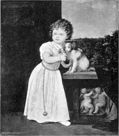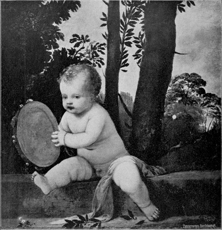 Als ein kleines nicht religiöses Werk sei hier das köstliche Bildchen in der kaiserlichen Gemäldegalerie zu Wien erwähnt, auf dem ein nacktes Knäblein dargestellt ist, das im Grünen auf einer niedrigen Steinbank sitzt und sich mit einem Tambourin belustigt (Abb. 11). Wenn das Kind als Amor bezeichnet wird, so liegt dazu kein Grund vor; weder die Flügel noch sonst eine Kennzeichnung des Liebesgottes sind vorhanden. Eher darf man wohl an ein Porträt eines hübschen Kindes denken. Es wird bezweifelt, ob das Bildchen wirklich von Tizian gemalt sei, da die Malweise etwas zu hart für ihn erscheint. Aber ein überzeugender Gegenbeweis gegen seine Urheberschaft ist damit durchaus nicht gegeben. Vielmehr sind der muntere Liebreiz des Kindes und die entzückende Art und Weise,[S. 17] wie das Figürchen mit der Landschaft zusammenkomponiert ist, ganz und gar Tizianisch.